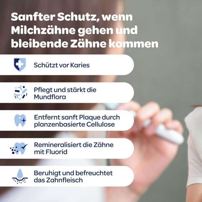 Детская зубная паста Dentinox Zahncreme Mundflora+ Junior специально разработана для детей 6-12 лет в период смены зубов. Содержит фторид натрия (1450 ppm) для защиты от кариеса, пантенол и гиалуронат для успокоения десен, микробиом-комплекс для поддержания баланса микрофлоры полости рта. Без консервантов, красителей, сахара, лактозы и глюгена. 98% ингредиентов натурального происхождения, веганская.
