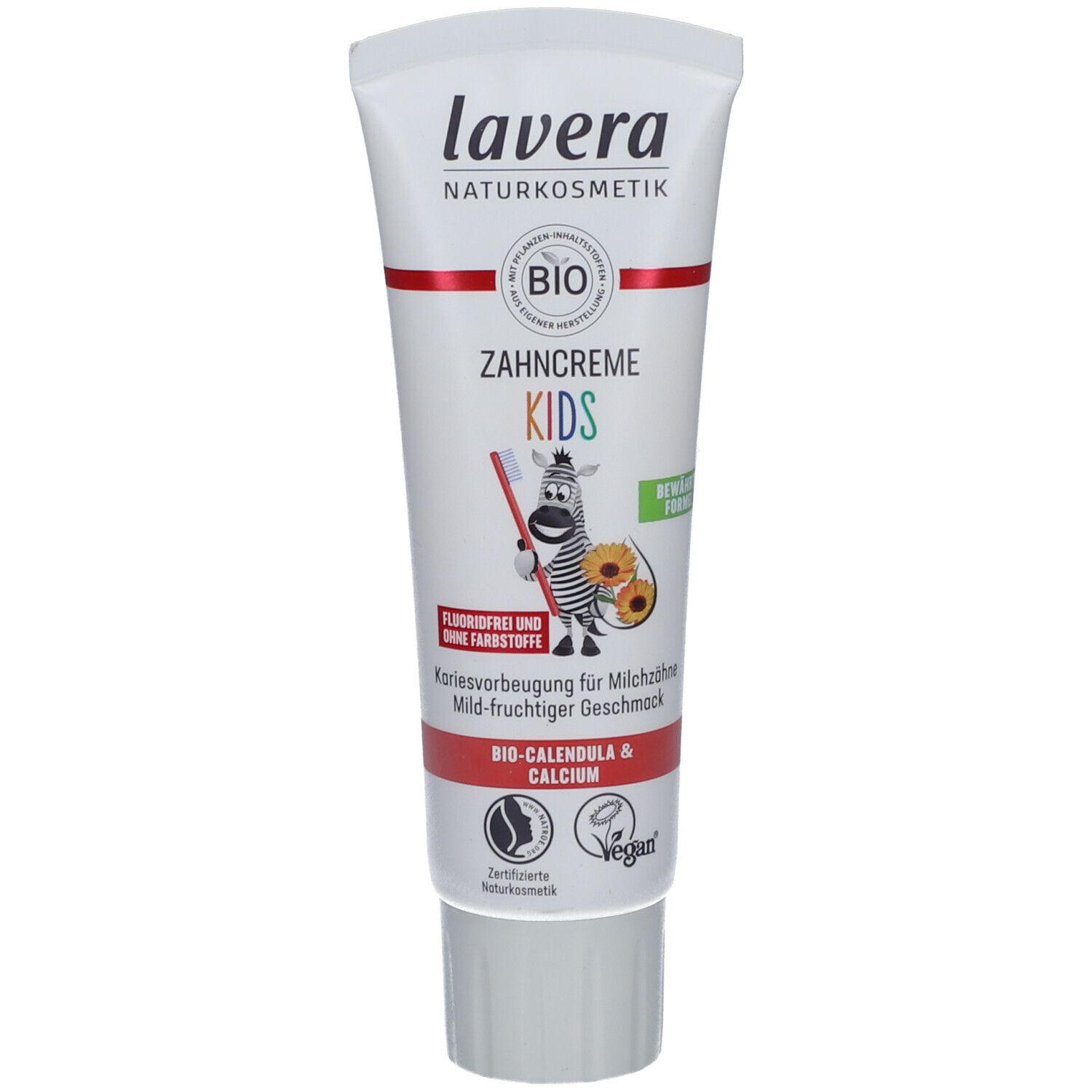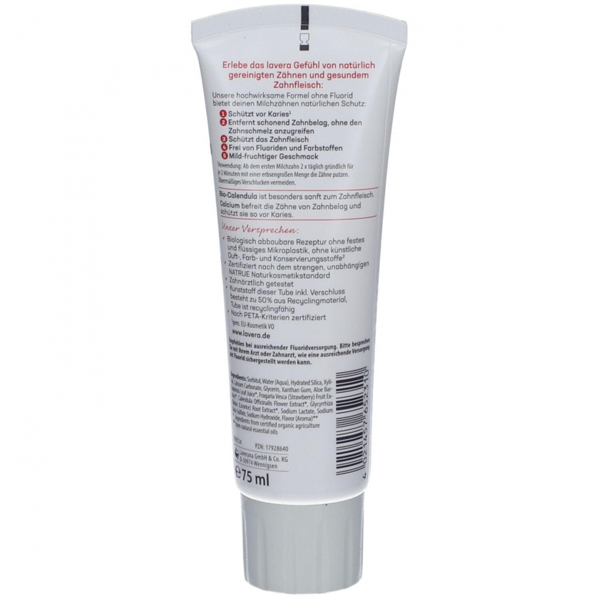 Детская зубная паста Lavera без фтора для молочных зубов и десен. Натуральная формула с органическими экстрактами алоэ, земляники, календулы и солодки. Без фторидов и красителей, с мягким фруктовым вкусом. Подходит для детей с первого молочного зуба.