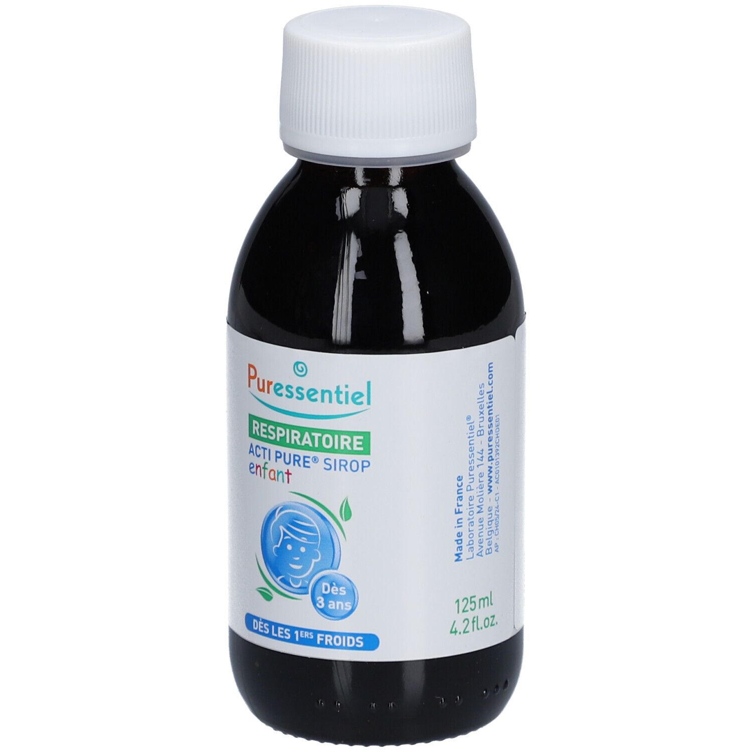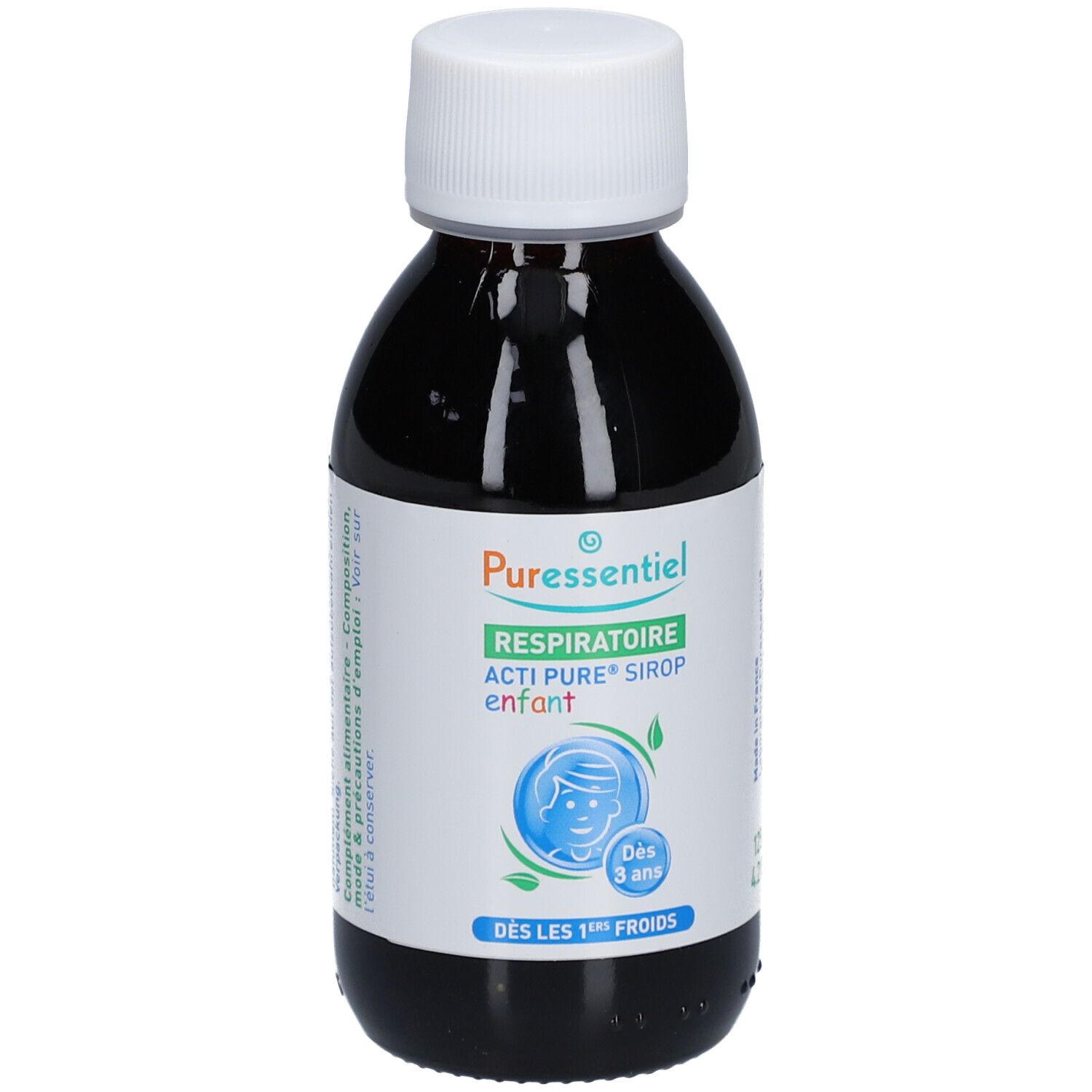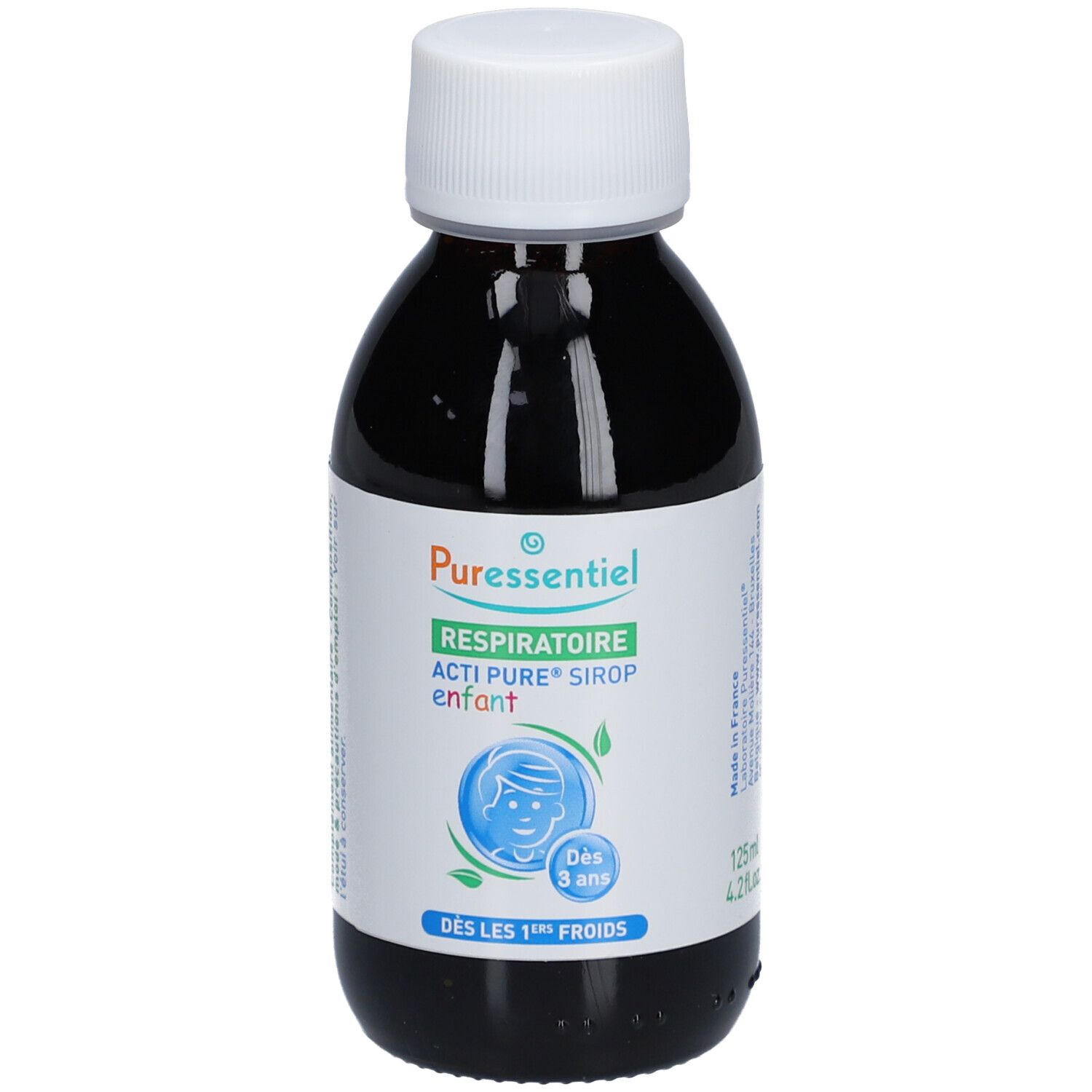 Детский сироп Puressentiel Actipure для поддержки иммунитета и успокоения дыхательных путей у детей от 3 лет. Натуральная формула с медом, бузиной, желтушником и витамином D3. Объем 125 мл.