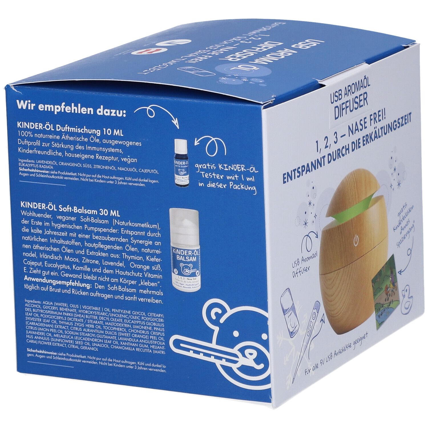 Пластиковый корпус, электронные компоненты, ультразвуковой распылитель, светодиодная подсветка. В комплекте: диффузор, инструкция, USB-кабель 1 м, запасные ватные палочки, тестер детского масла, детская книжка с раскрасками.
