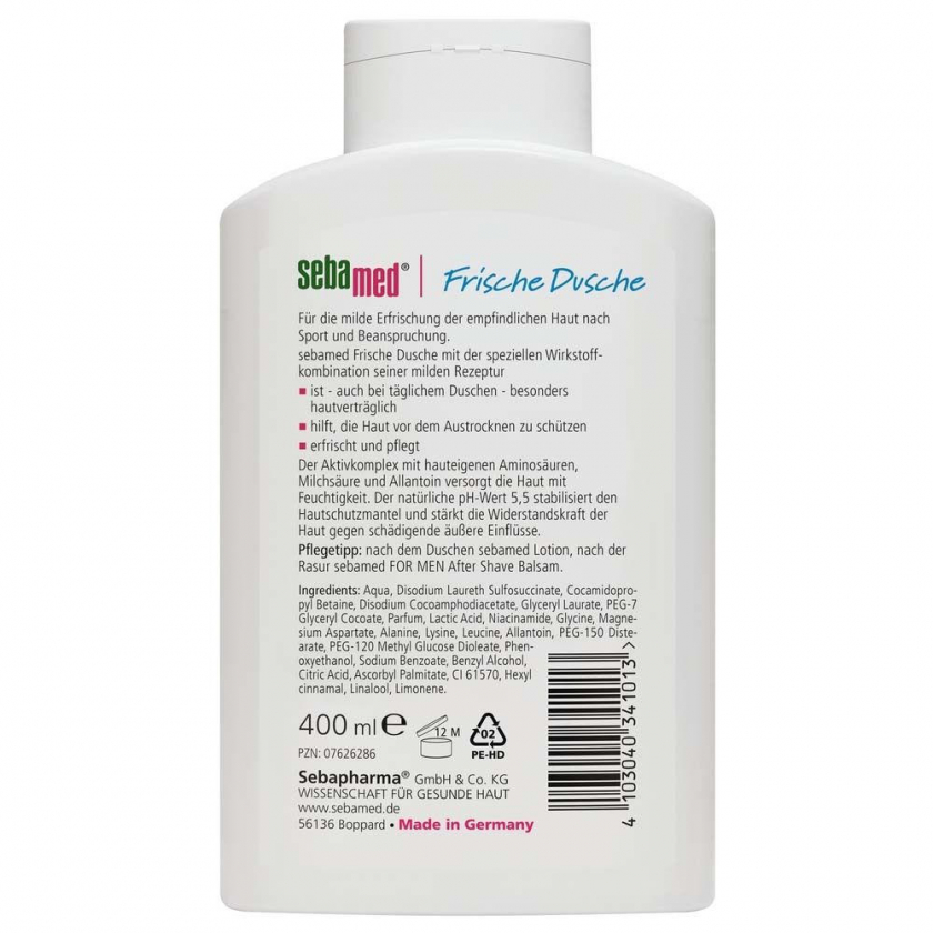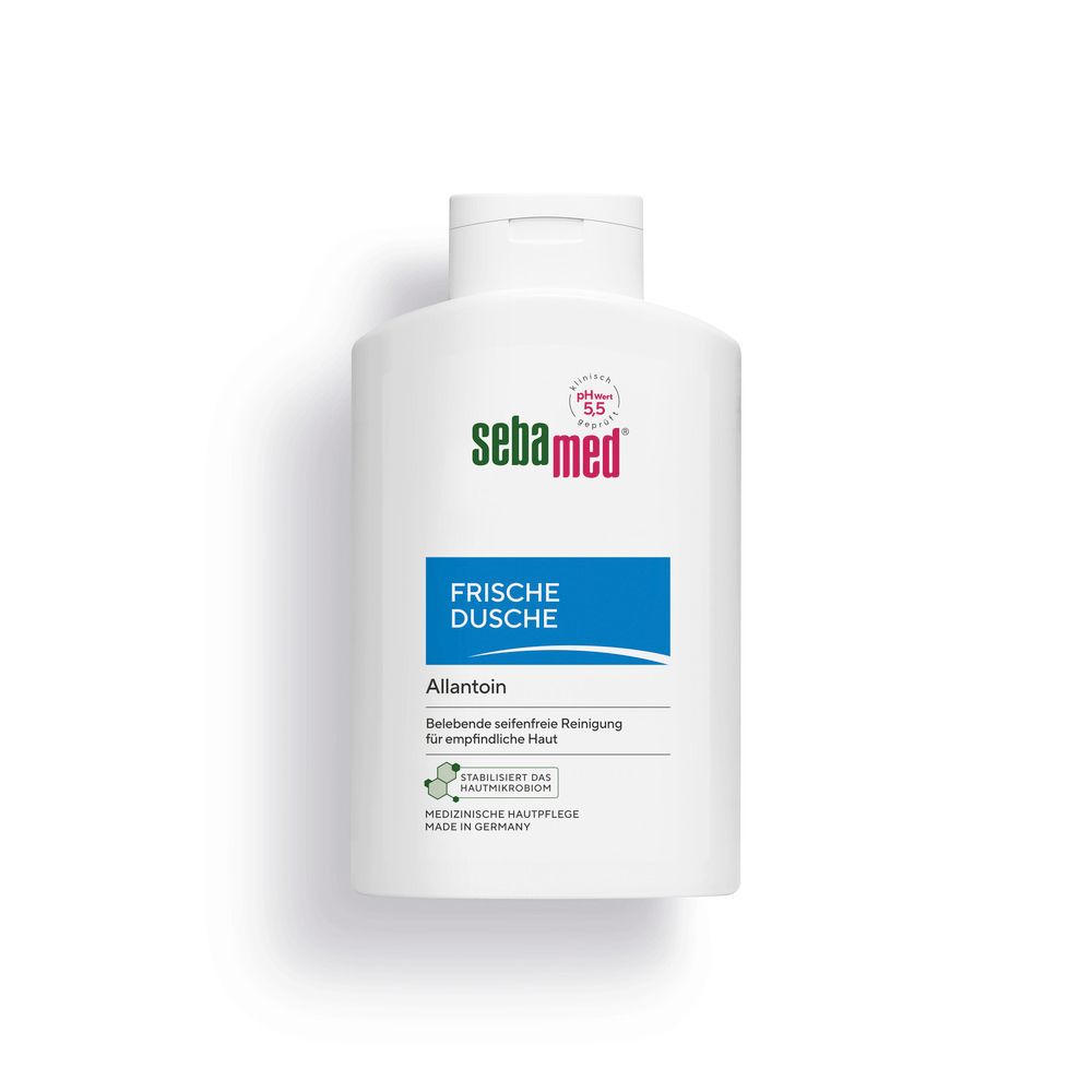 SEBAMED Frische Dusche - гель для душа для чувствительной и сухой кожи с pH 5,5. Защищает кожу от пересыхания, обеспечивает длительное ощущение свежести, увлажняет с помощью аминокислот и аллантоина. Подходит для ежедневного использования мужчинам и женщинам. Не содержит микропластика и силиконов, веганский продукт.