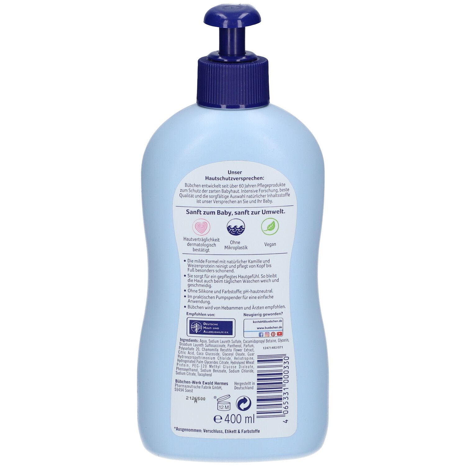 Мягкое гель для мытья Bübchen с экстрактом ромашки и пшеничным белком для ежедневного ухода за нежной детской кожей. Защищает кожу, поддерживает естественный барьер, pH-нейтральное, без аллергенных отдушек, рекомендовано дерматологами, акушерами и врачами.