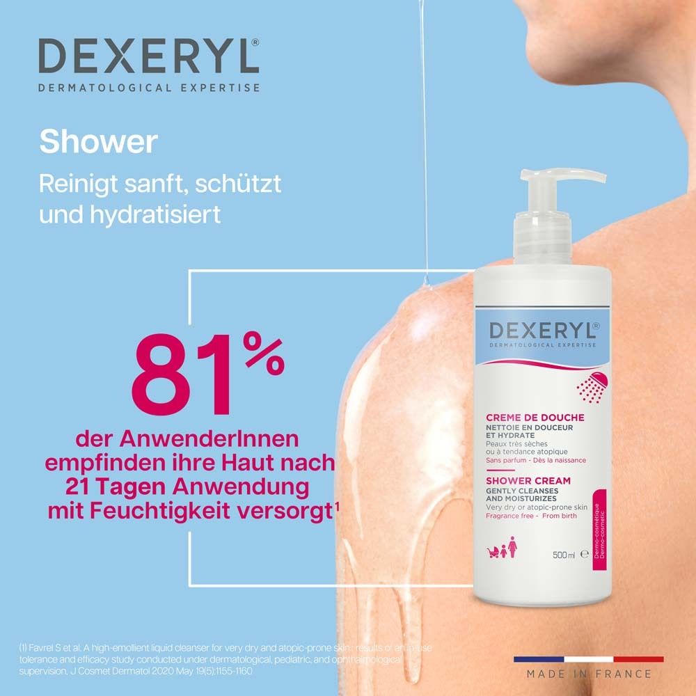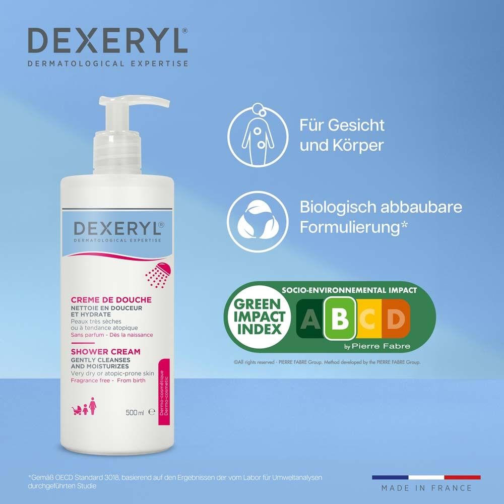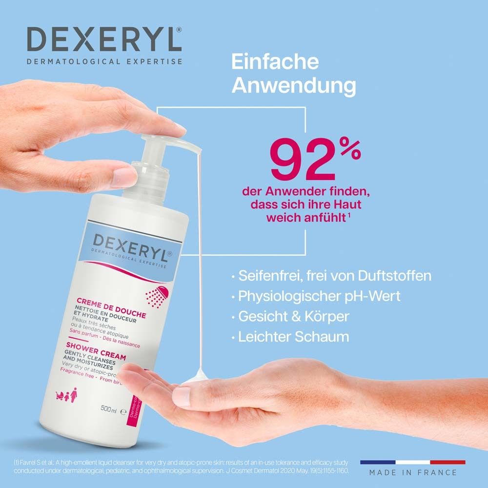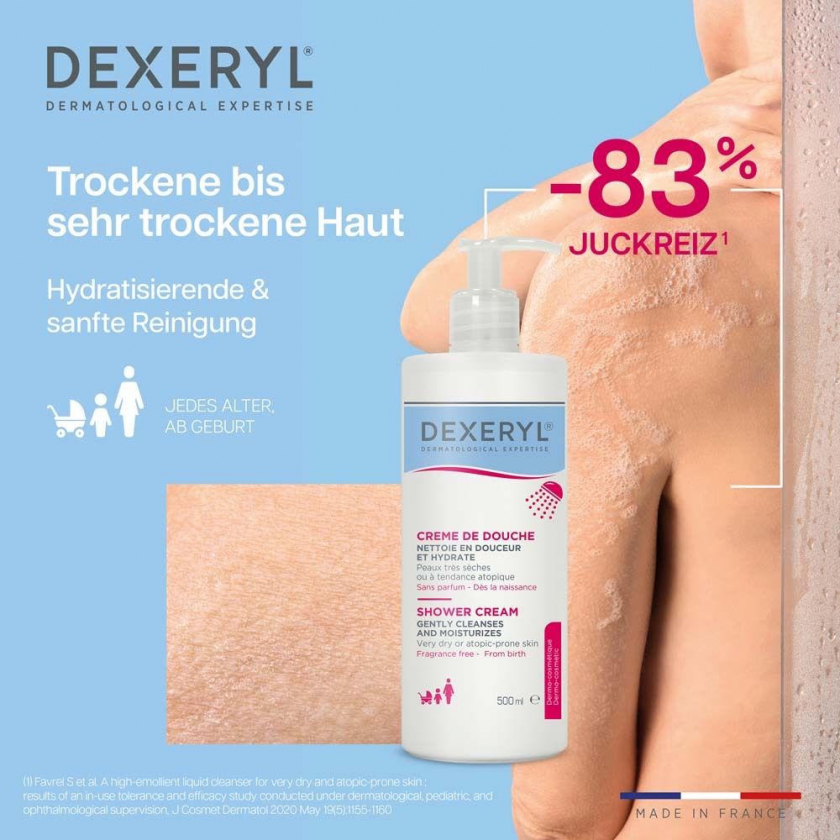 DEXERYL® Duschcreme - гипоаллергенная душевая крем-пенка для мягкого очищения и интенсивного увлажнения очень сухой кожи, склонной к нейродермиту. Подходит для всей семьи, включая младенцев и детей. Без парфюма и мыла, дерматологически протестирована