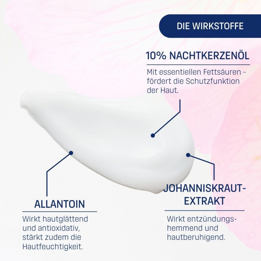 Состав: Вода, масло энотеры (вечерней примулы), дикаприловый эфир, глицерин, цетеарил этилгексаноат, диизостеароил полиглицерил-3 димер дилинолеат, пантенол, токоферила ацетат, сульфат магния, экстракт зверобоя, гидрогенизированное касторовое масло, белый воск, гидрогенизированное растительное масло, бисаболол, мочевина, аллантоин, п-анисовая кислота, фенилэтиловый спирт, бутиленгликоль, фитат натрия, токоферол, аскорбил пальмитат, гидроксид натрия, молочная кислота, лимонная кислота