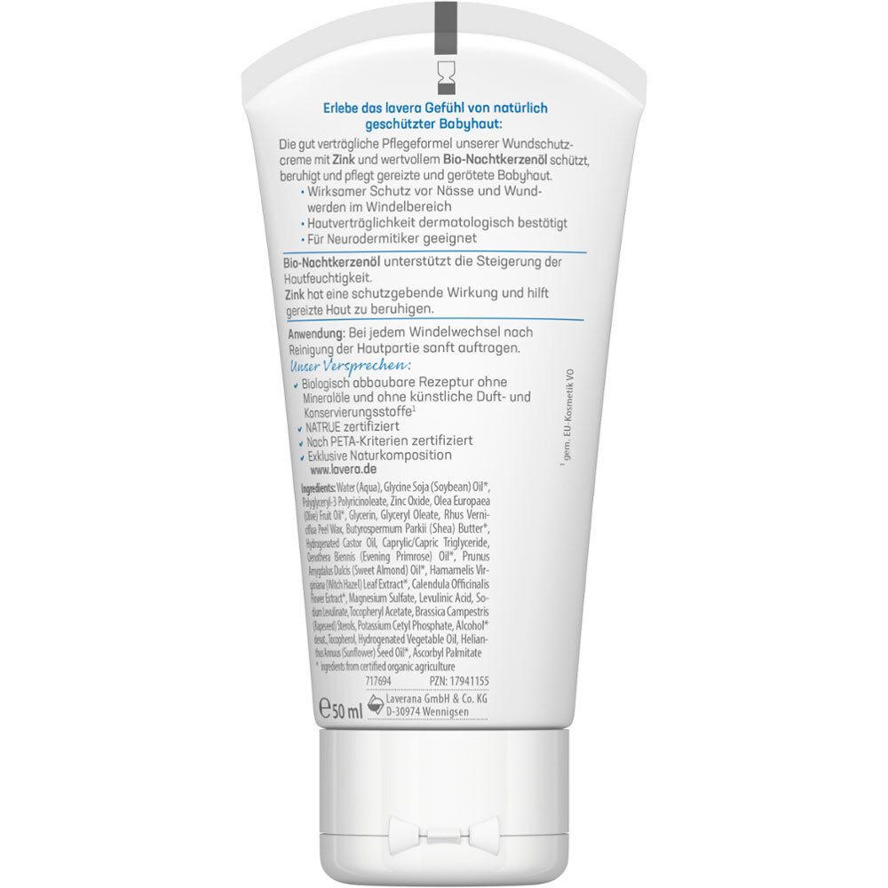 Органическая защитная крем-паста для детей lavera с цинком и маслом энотеры для профилактики опрелостей и раздражений в области подгузника. Веганская формула без минеральных масел, искусственных ароматизаторов и консервантов, дерматологически протестирована.