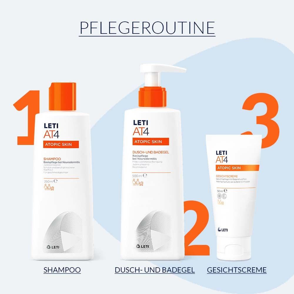 LETI AT4 Shampoo - экстрамягкий шампунь для сухой и склонной к нейродермиту кожи головы. Уменьшает сухость, раздражения, зуд и молочные корки, восстанавливает кожный барьер и баланс микробиома. Подходит для детей от 3 месяцев и взрослых. Не содержит парабенов, протестирован дерматологически и педиатрически.