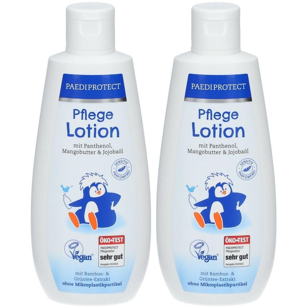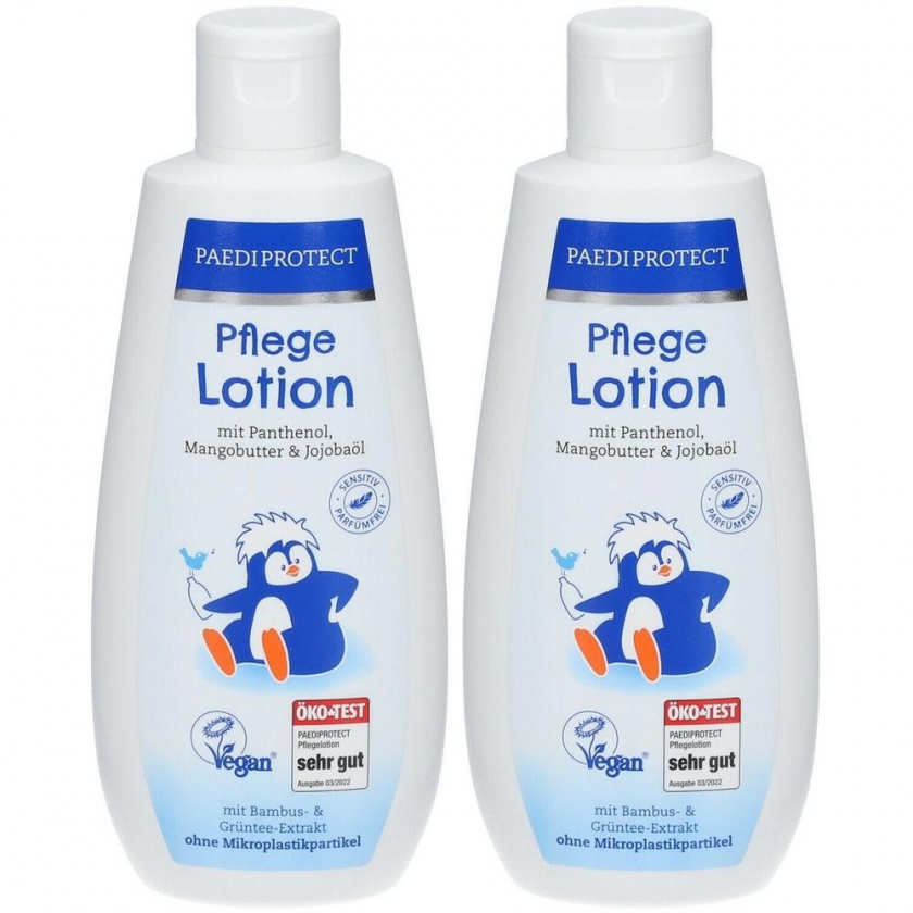 PAEDIPROTECT Pflegelotion - увлажняющий лосьон для ухода за чувствительной кожей детей и взрослых. Содержит пантенол, масло жожоба и манго, экстракты бамбука и зеленого чая. Без парабенов, парафинов, парфюма, консервантов, лактозы, алкоголя и сахара. Веганский продукт без микропластика.