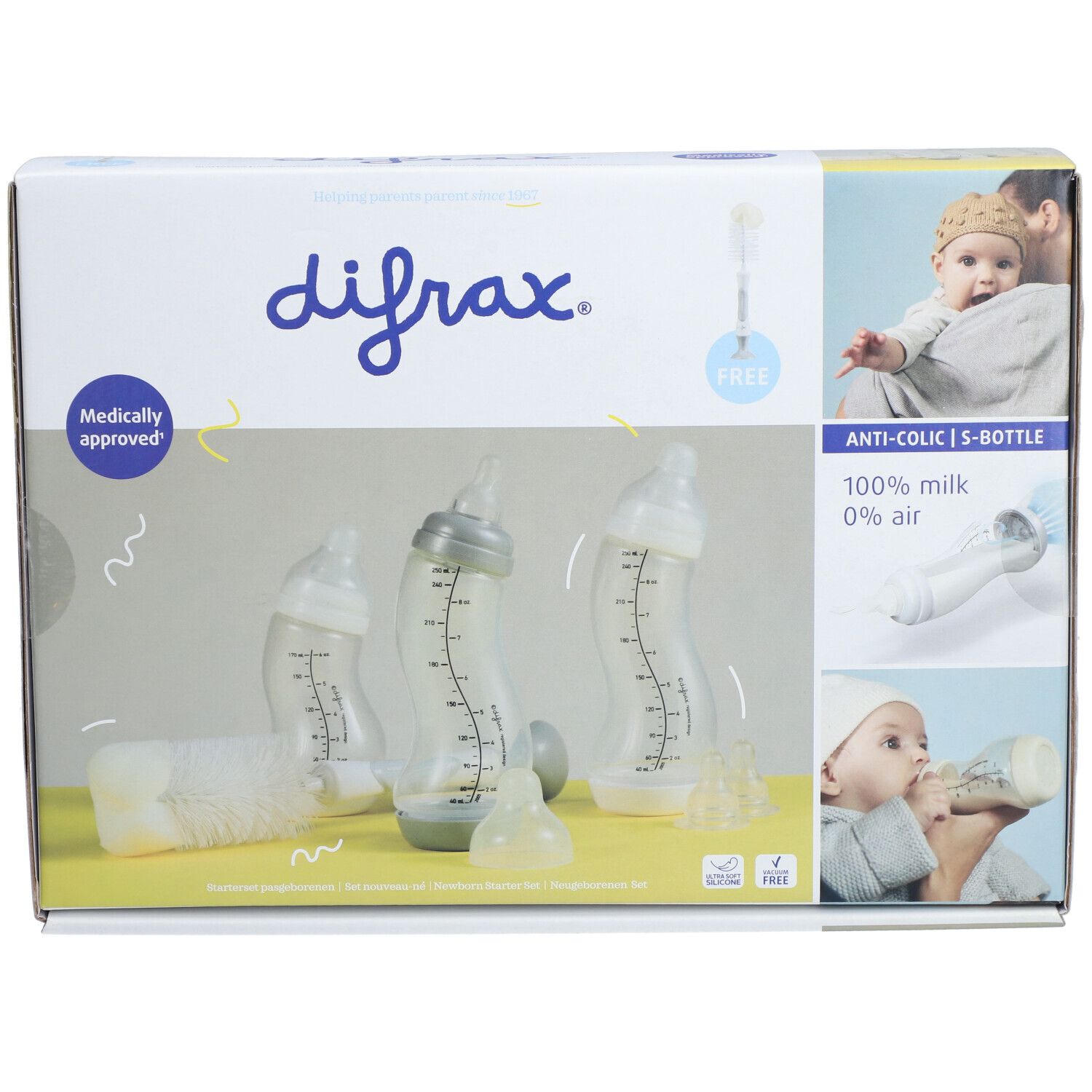 Набор для новорожденных Difrax включает 3 бутылочки с антиколиковым клапаном (170 мл и 2x250 мл), 2 средние соски и щетку для чистки. Идеально подходит для комбинирования грудного вскармливания и кормления из бутылочки.