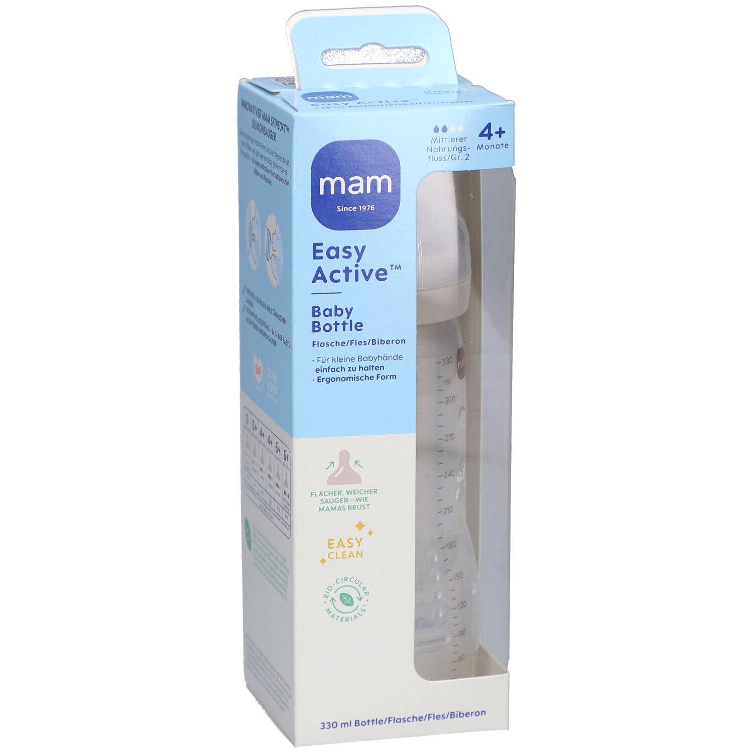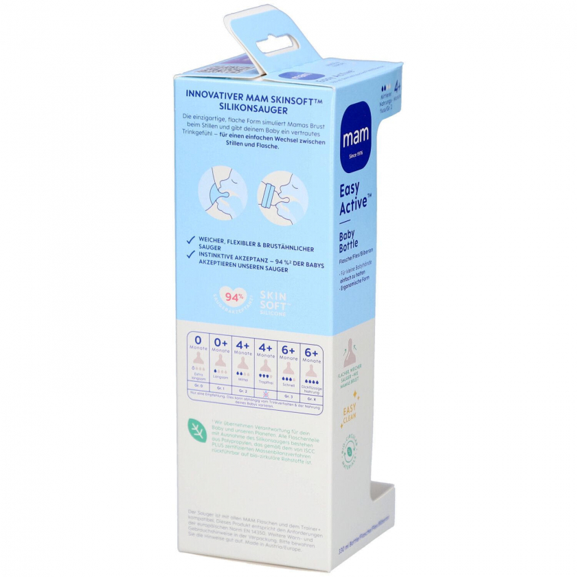 Детская бутылочка Easy Active™ объемом 330 мл с эргономичной формой для удобного удержания маленькими руками. Имеет плоский мягкий сосок, имитирующий материнскую грудь, который принимают 94% младенцев. Большие отверстия для легкого наполнения и очистки. Подходит для новорожденных и младенцев с системой размеров сосок от 0 до X.