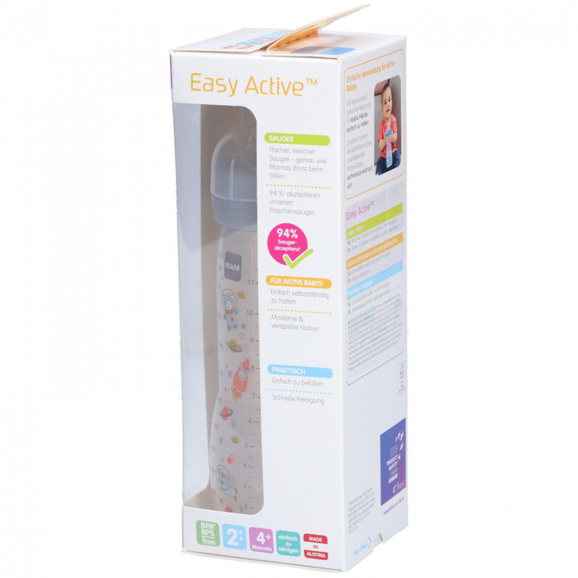 Детская бутылочка MAM Easy Active для активных малышей от 4 месяцев с эргономичной формой, плоским мягким соском, имитирующим материнскую грудь, и широким горлышком для легкого наполнения и очистки