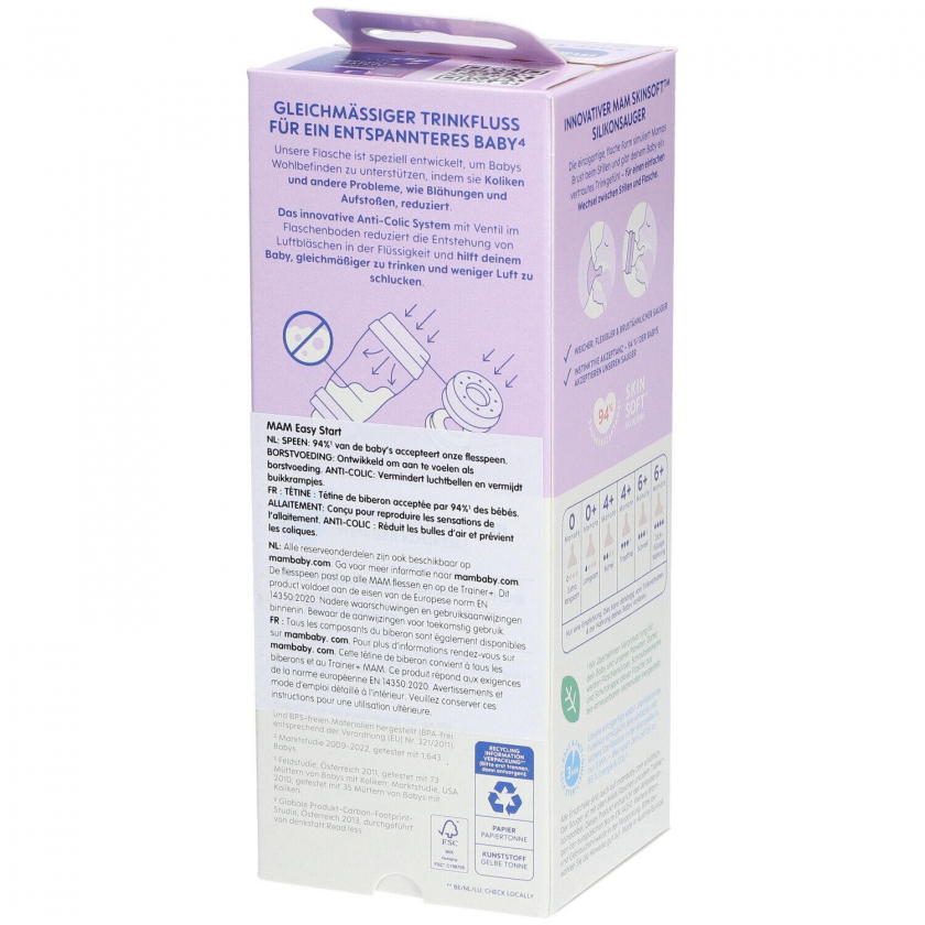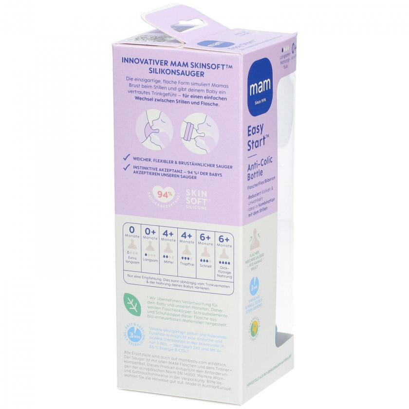 Детская бутылочка MAM Easy Start™ Anti-Kolik объемом 260 мл для новорожденных от 0 месяцев с антиколиковой системой, плоским мягким соском, имитирующим материнскую грудь, и уникальной функцией самостерилизации в микроволновке за 3 минуты. Уменьшает колики и дискомфорт у младенцев, облегчает переход от груди к бутылочке и обратно.