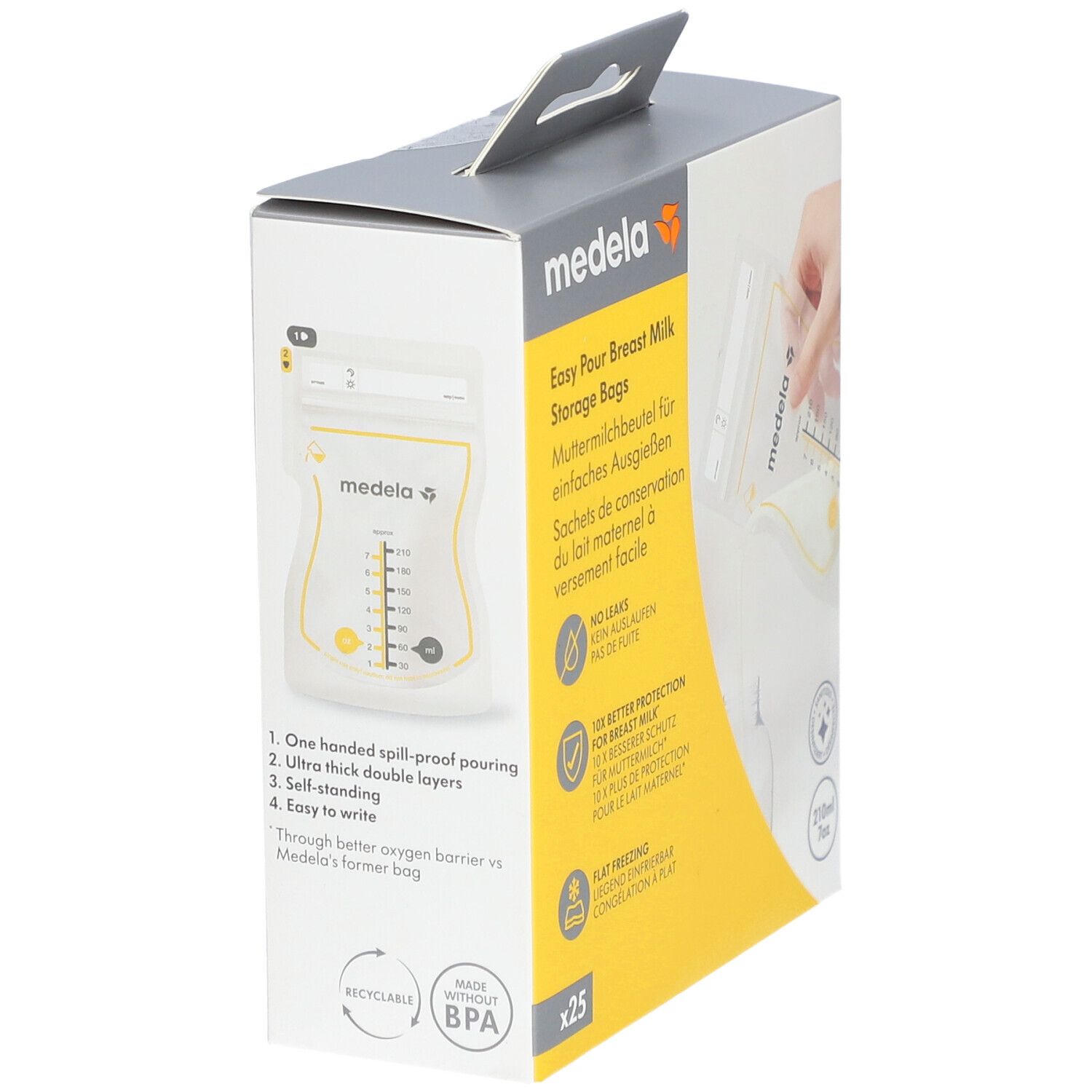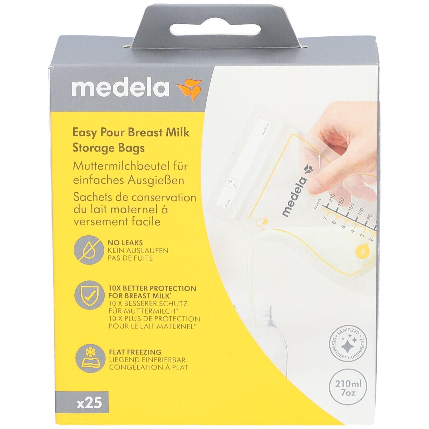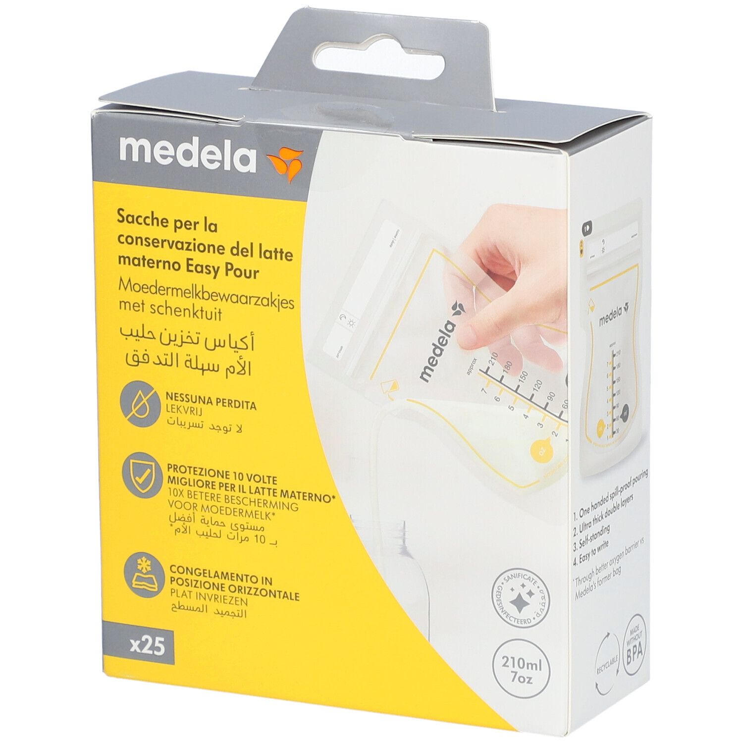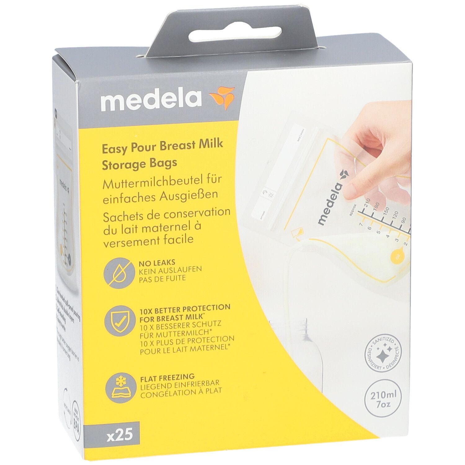 Пакеты для хранения грудного молока Medela объемом 210 мл с двойным замком от протекания, термосварными швами, возможностью вертикального заполнения и специальным отверстием для удобного переливания. В комплекте транспортировочный чехол для чистого хранения.