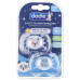 Анатомические соски-пустышки dodie® Duo для детей от 18 месяцев. Набор из 2 пустышек с фосфоресцирующей кнопкой для ночного поиска, удобным щитком из Tritan и вентиляционными отверстиями для предотвращения раздражения кожи.