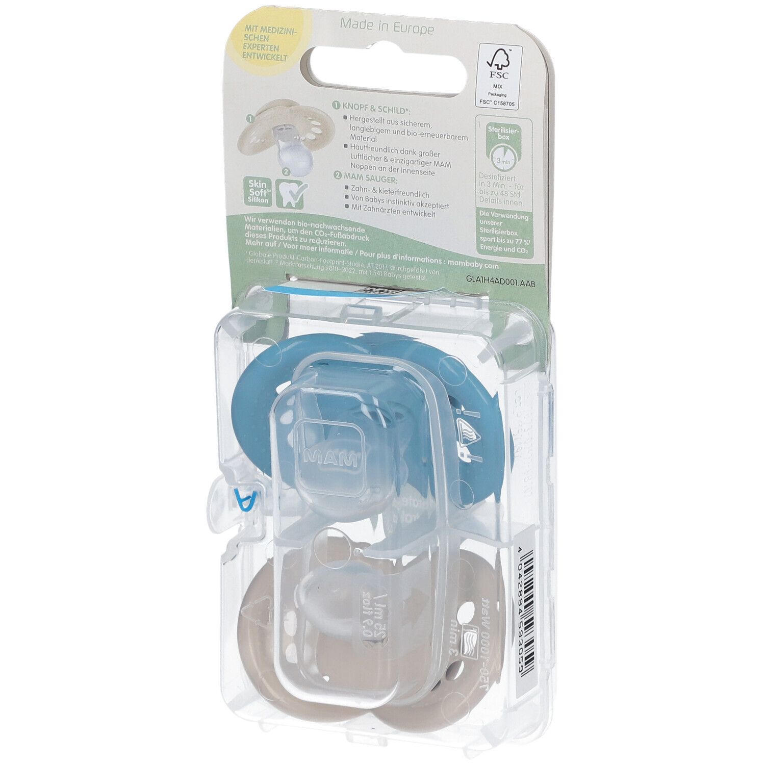 Набор из 2 ортодонтических силиконовых сосок-пустышек MAM Original Pure для детей от 16 месяцев с транспортной и стерилизационной коробкой. Симметричный плоский дизайн разработан совместно со стоматологами для здорового развития зубов, имеет большие отверстия для дыхания кожи и уникальные MAM отверстия на внутренней стороне.