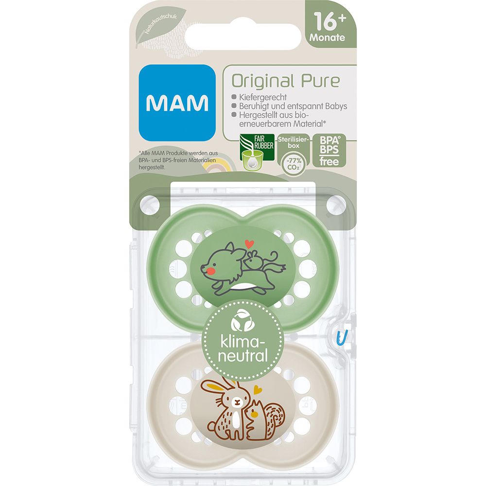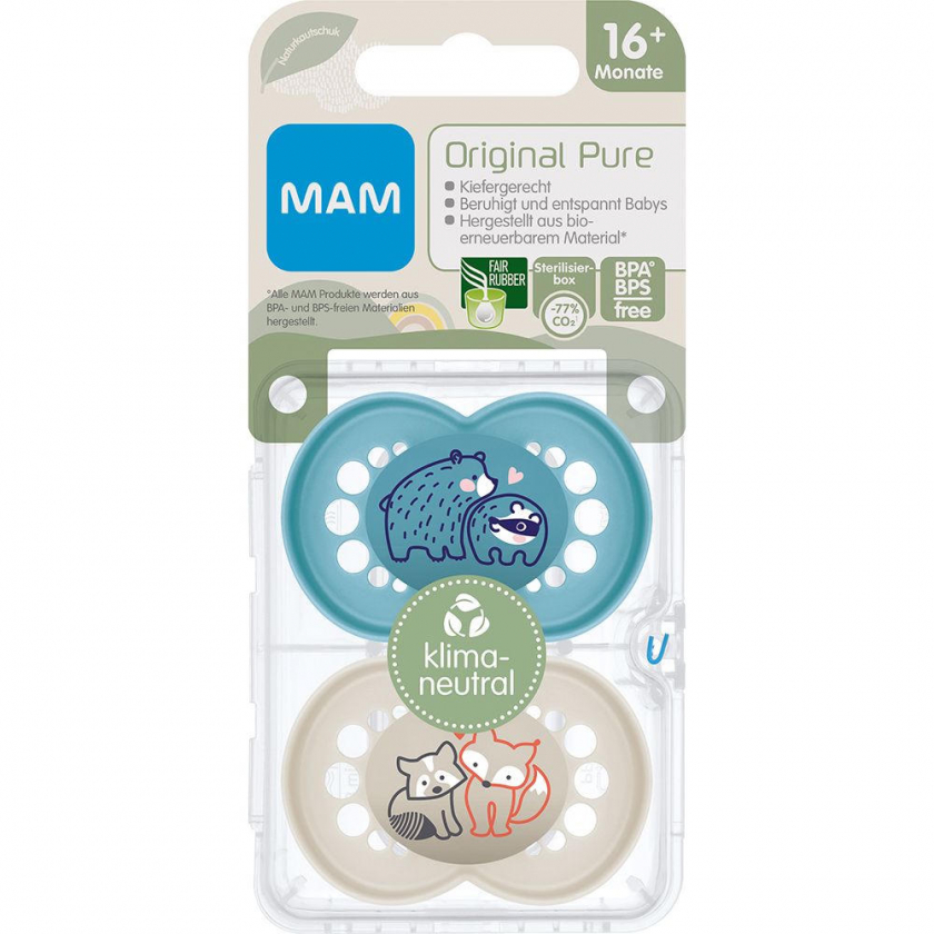 MAM Original Pure - первый климатически нейтральный силиконовый пустышка для детей от 16 месяцев. Разработан совместно с ортодонтами, имеет зубодружественный дизайн, мягкий силикон SkinSoft, био-возобновляемые материалы. В комплекте стерилизационная коробка для микроволновки. Без BPA/BPS, соответствует стандарту EN 1400.