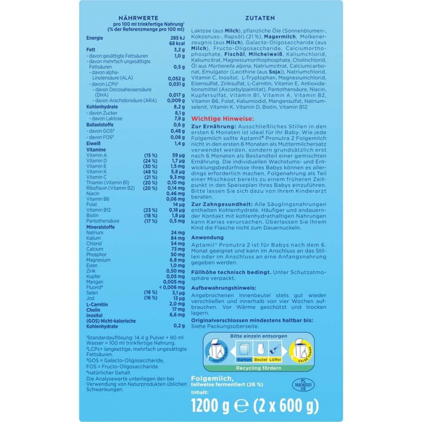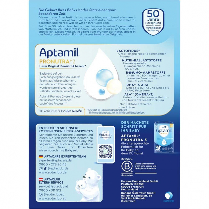 Детская молочная смесь Aptamil Folgemilch 2 Pronutra+ для питания детей после 6 месяцев. Содержит запатентованную формулу Pronutra+ с GOS/FOS для поддержки иммунитета, DHA для развития мозга и глаз, витамин D и кальций для роста костей, железо для когнитивного развития. Без добавления сахара и искусственных ароматизаторов.
