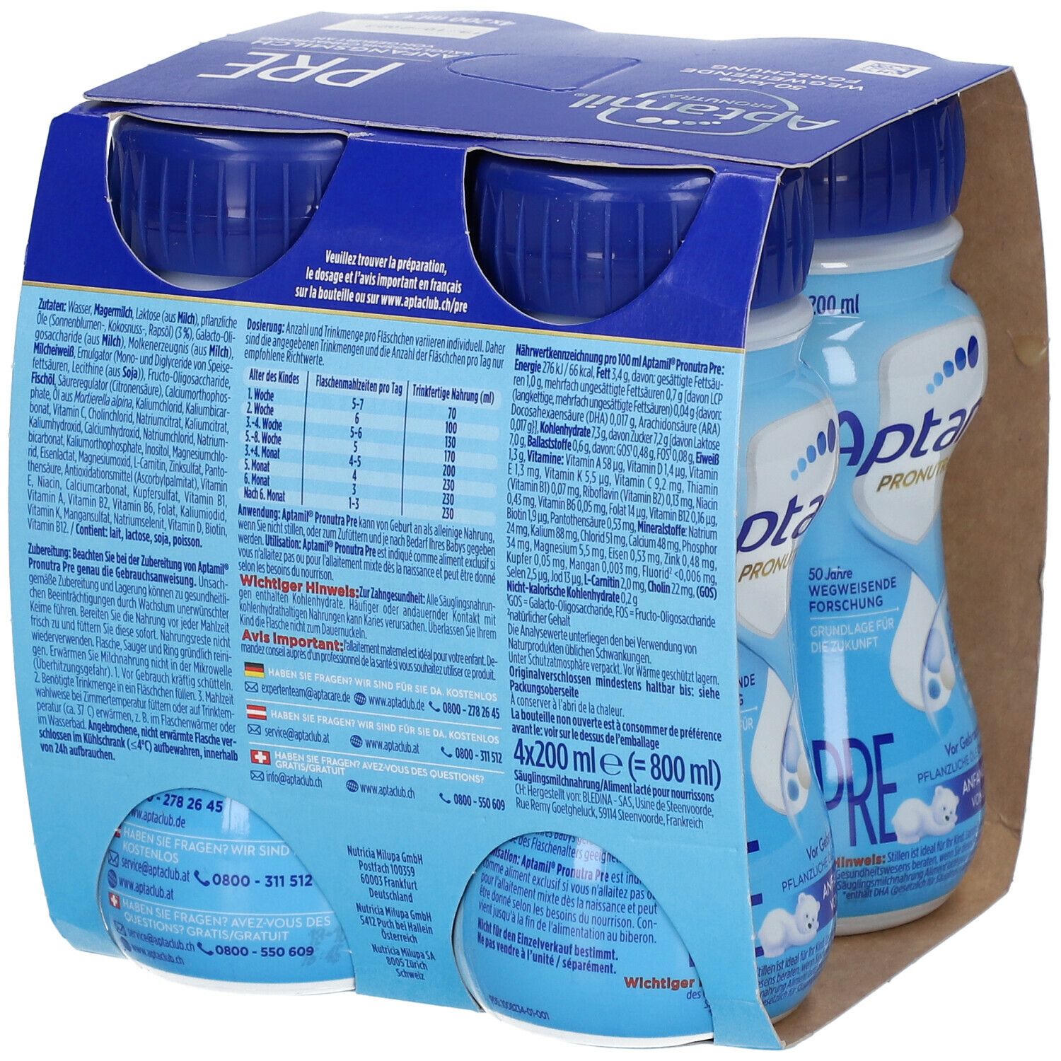 Готовая к употреблению молочная смесь Aptamil® Pre для новорожденных с рождения, содержащая лактозу, DHA и пребиотики GOS/FOS. Подходит для полного питания младенцев при невозможности грудного вскармливания. Производится в Швейцарии компанией Nutricia с использованием запатентованной формулы Pronutra.
