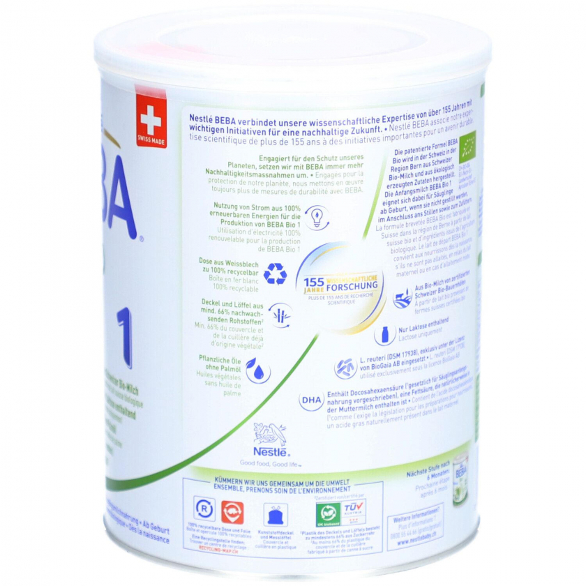 BEBA Bio 1 - органическая молочная смесь для новорожденных с рождения, произведенная из швейцарского органического молока. Содержит пробиотик L. reuteri и DHA, не содержит пальмового масла. Подходит как для полного искусственного вскармливания, так и для докорма после грудного молока.