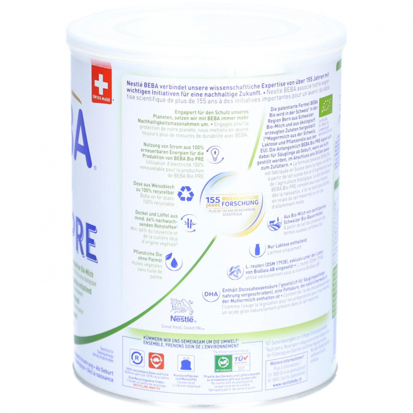BEBA Bio PRE - органическая начальная молочная смесь для новорожденных с рождения из швейцарского органического молока. Содержит только лактозу как источник углеводов, без пальмового масла, с DHA и натуральной молочнокислой бактерией L. reuteri. Подходит как для полного питания, так и для докорма.