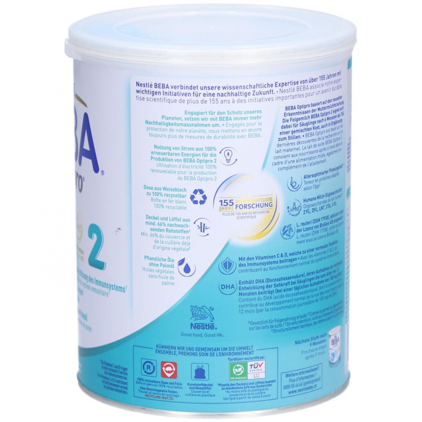 BEBA Optipro 2 - последующая молочная смесь для младенцев от 6 месяцев с L. reuteri, DHA и 5 HMO для поддержки иммунной системы. Содержит витамины C и D для нормального развития костей, без пальмового масла. 800 г.