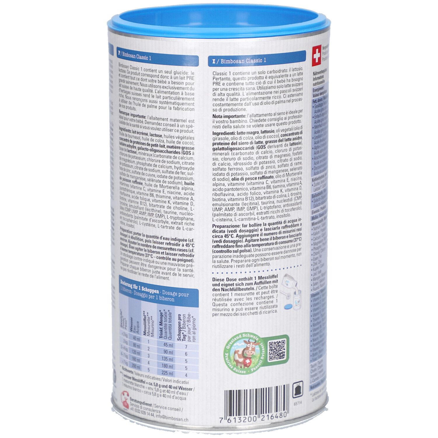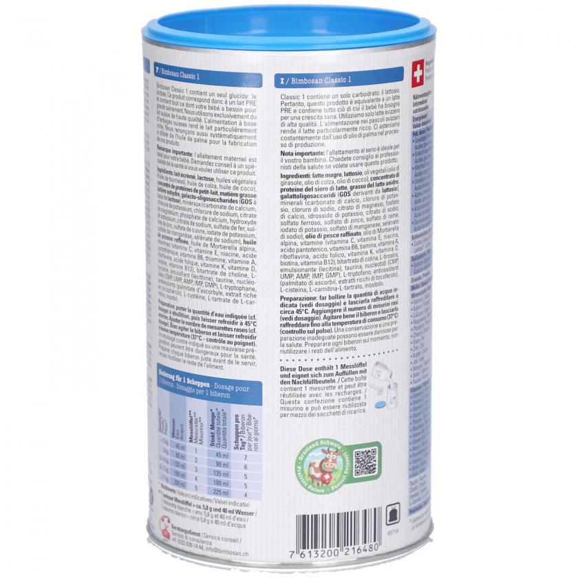 Bimbosan Classic 1 - детская молочная смесь для новорожденных с рождения, соответствующая PRE-стандарту. Содержит только лактозу в качестве углевода, без пальмового масла и крахмала. Произведена из высококачественного швейцарского молока, содержит галактоолигосахариды, нуклеотиды, витамины и минералы для здорового роста ребенка.
