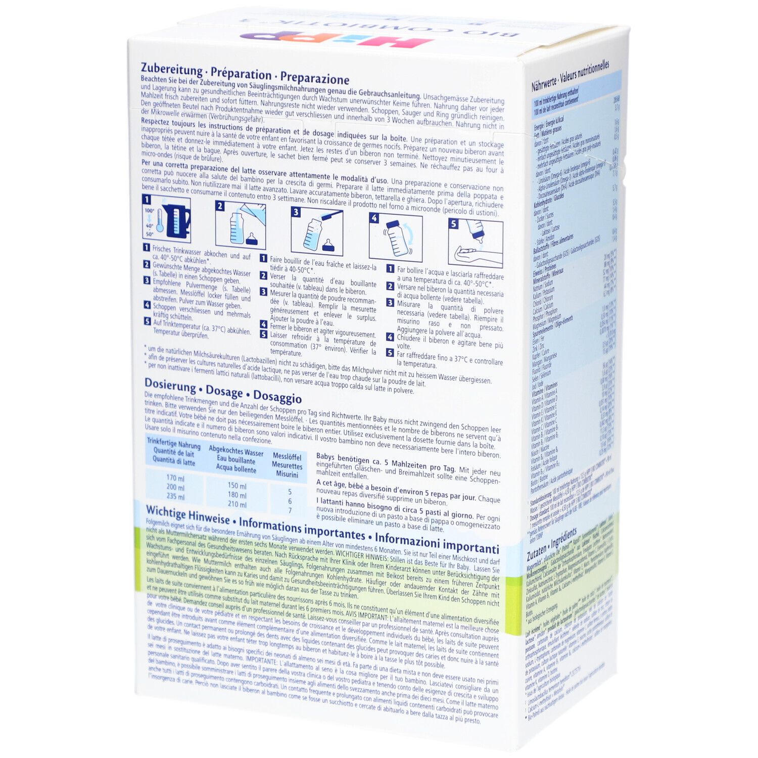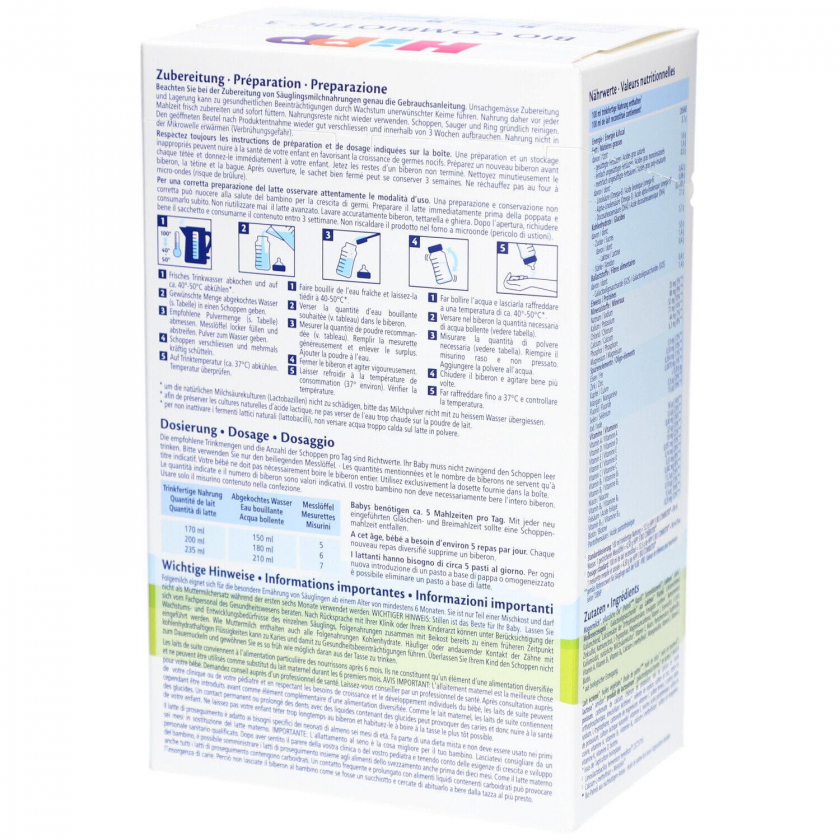 Состав: Магемолоко**, лактоза**, растительные масла** (подсолнечное, рапсовое), галакто-олигосахариды (GOS) на основе лактозы**, карбонат кальция, хлорид калия, хлорид магния, цитрат натрия, холинхлорид, L-фенилаланин, L-триптофан, L-цистин, сульфат железа, сульфат цинка, кальция-D-пантотенат, никотинамид, сульфат меди, витамин A, витамин B1, витамин B6, йодид калия, фолиевая кислота, селенат натрия, витамин K, витамин D, витамин B12, биотин (**из контролируемого органического земледелия)