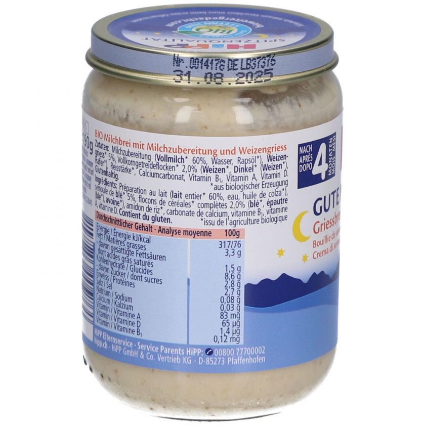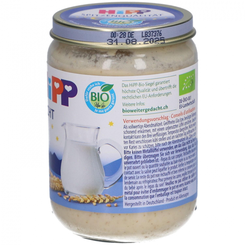 Органический детский каш HIPP Gute Nacht Porridge Pur для детей от 5 месяцев. Био-каша из манки с добавлением витаминов и кальция, подходит для вечернего кормления. Содержит молочную смесь, цельнозерновые хлопья и натуральные ингредиенты. Вес 190 г.