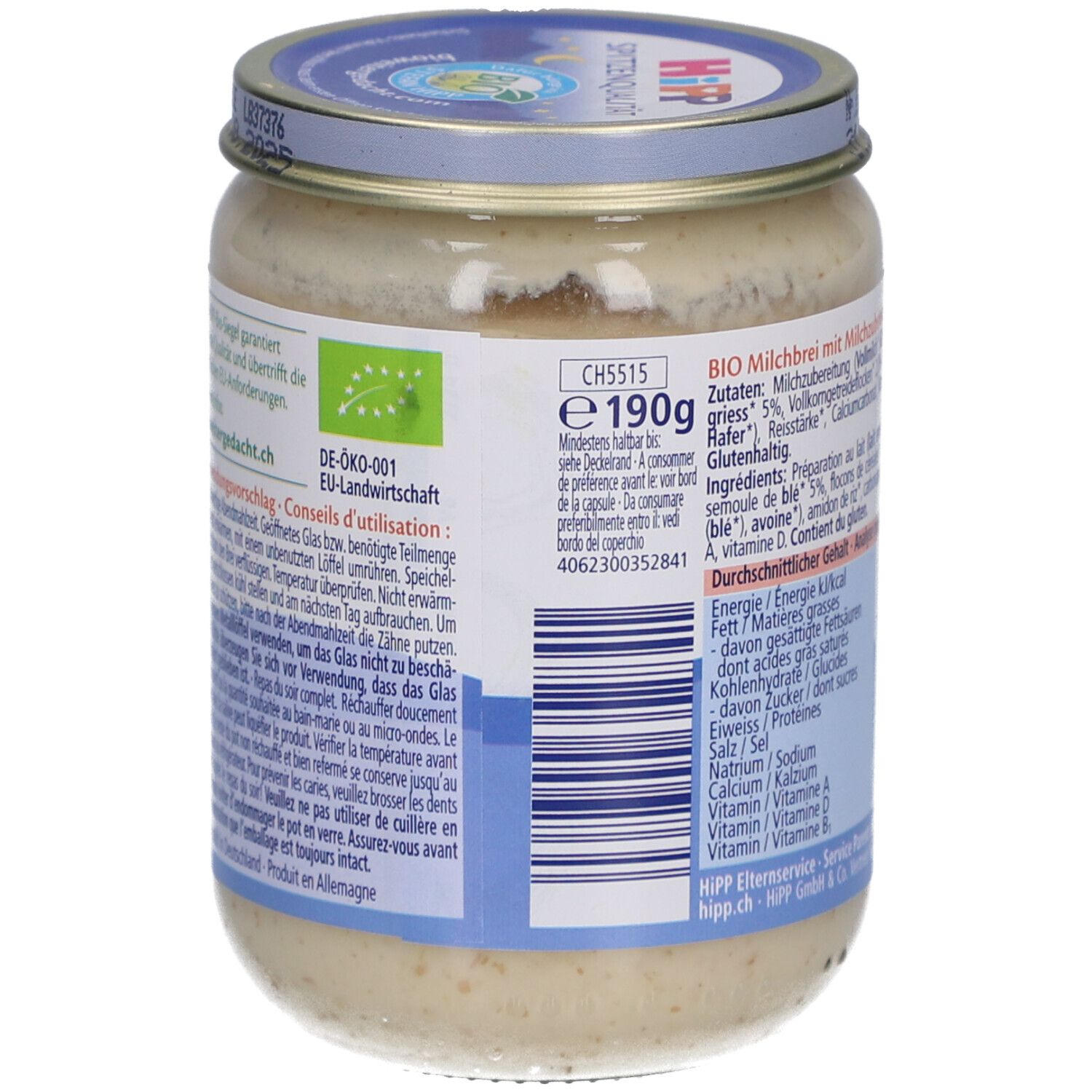 Состав: Молочная смесь (молоко 60%), вода, кукурузное масло, пшеничная манка 5%, цельнозерновые хлопья 2% (пшеница, полба, овес), рисовый крахмал, карбонат кальция, витамин B1, витамин A, витамин D. Содержит глютен. Продукт органического земледелия.