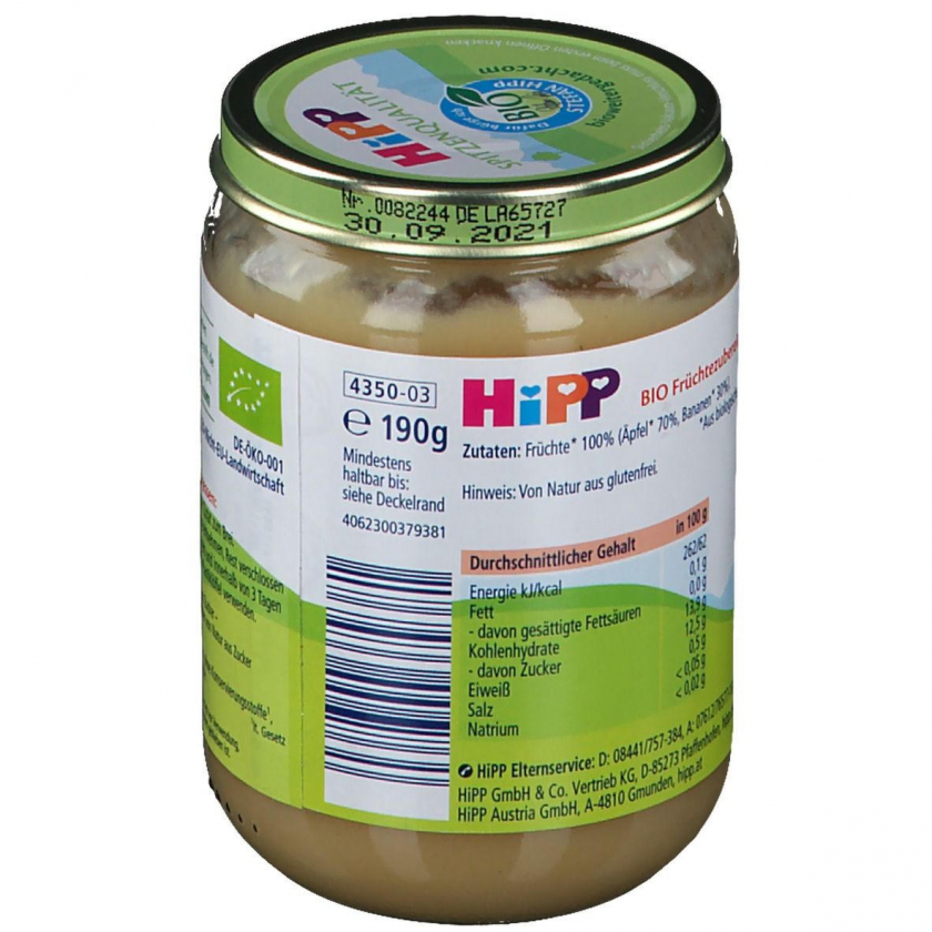 Органическое фруктовое пюре HiPP "Яблоки с бананами" для детей с 5 месяцев. Без добавления сахара, молочных продуктов, консервантов, ароматизаторов и красителей. Содержит витамин C. Подходит для прикорма в качестве перекуса, десерта или добавки к каше.