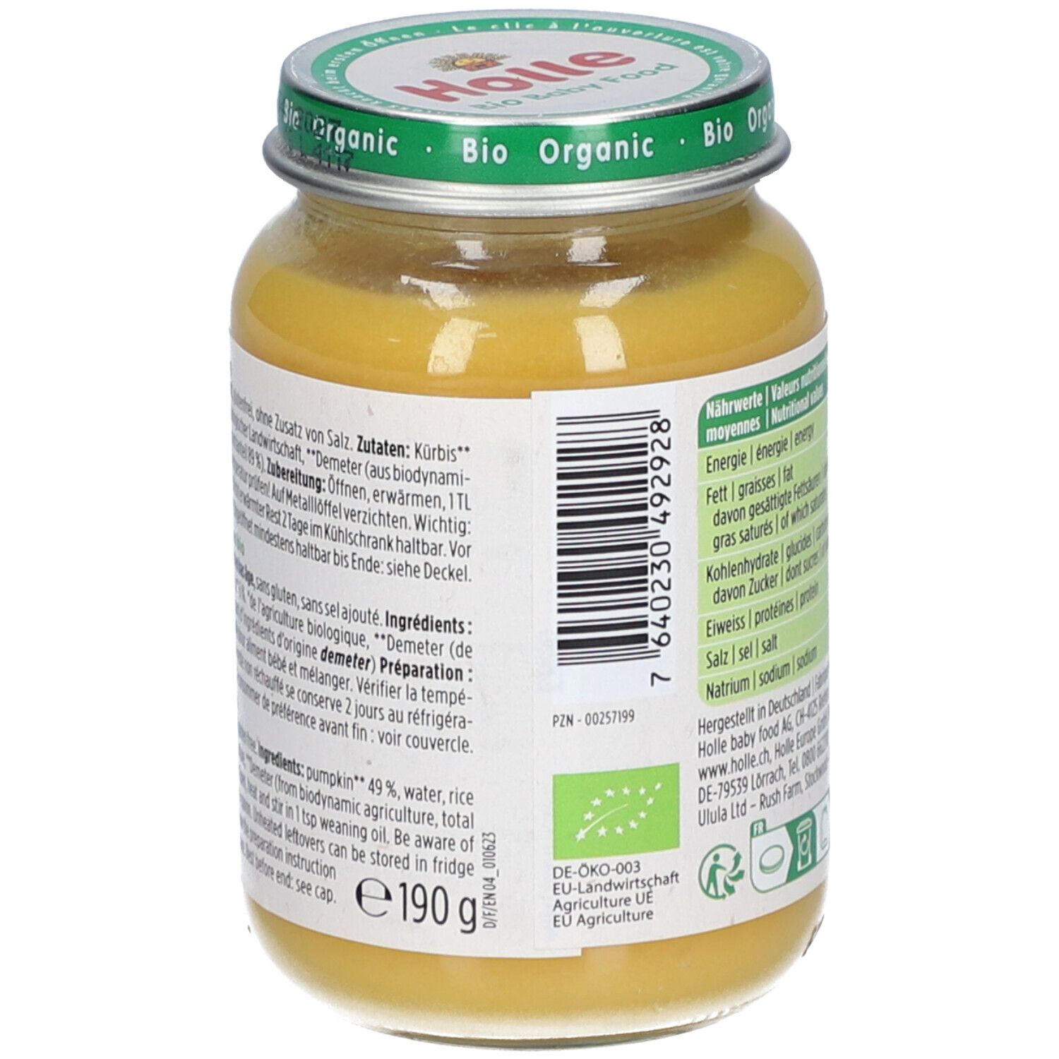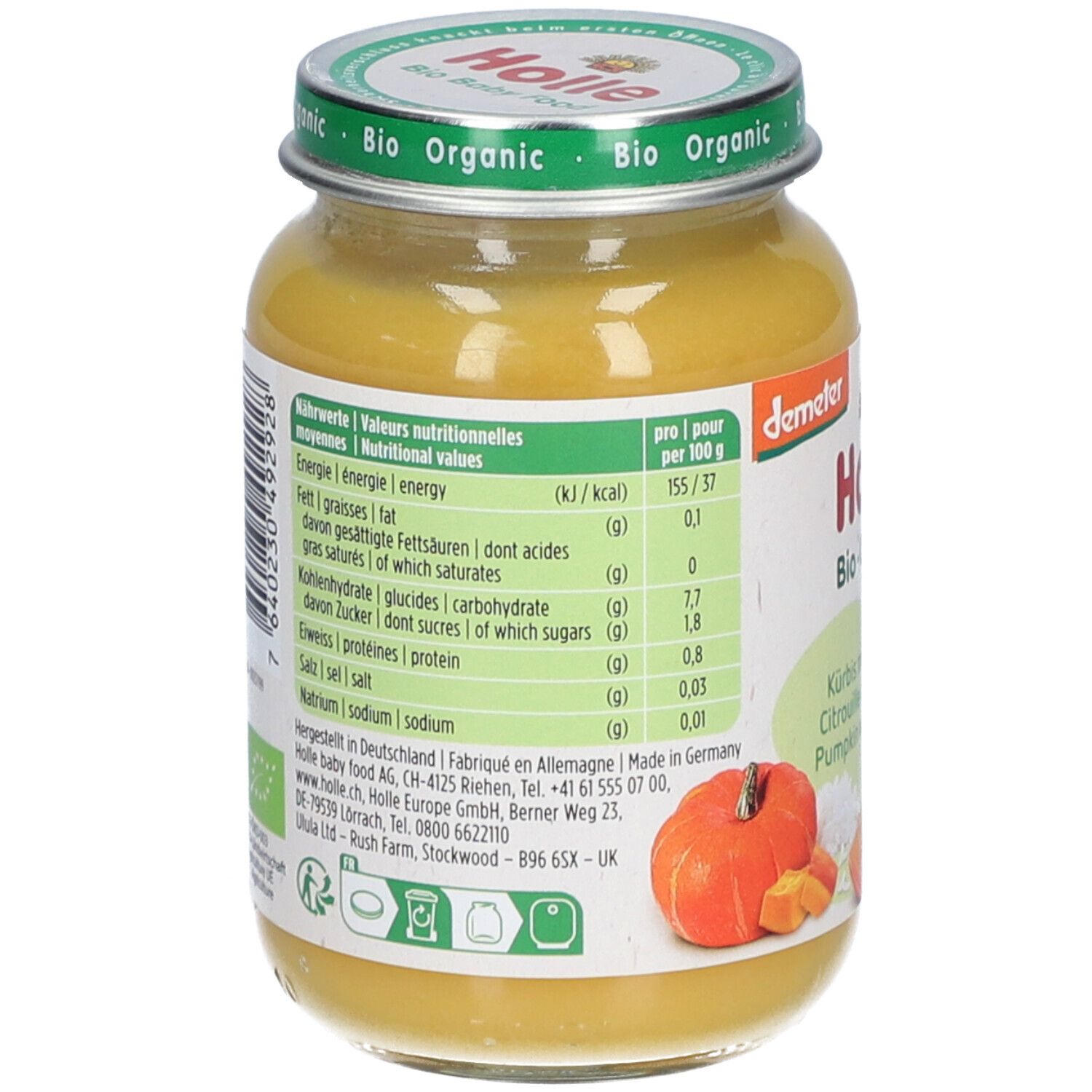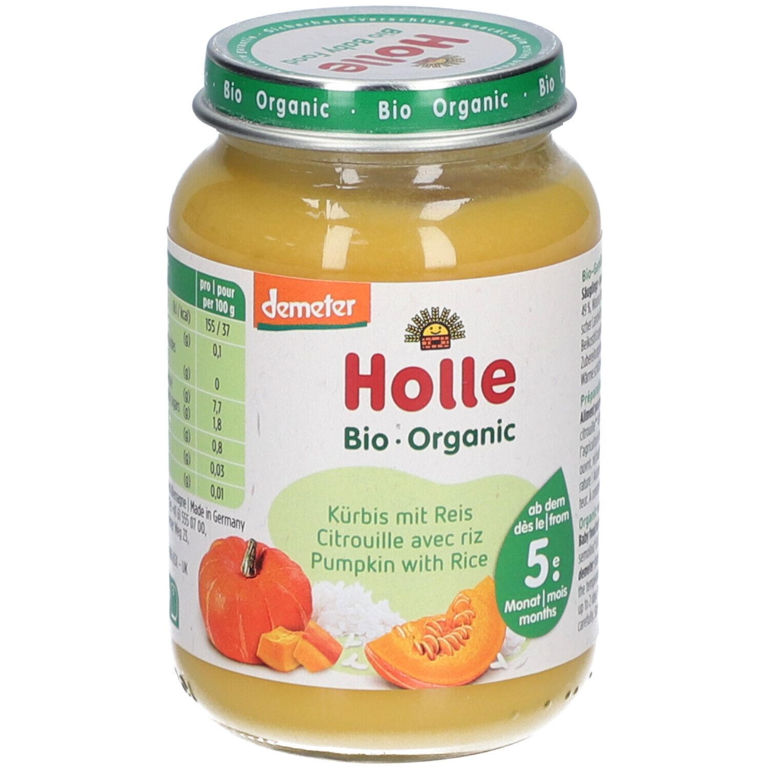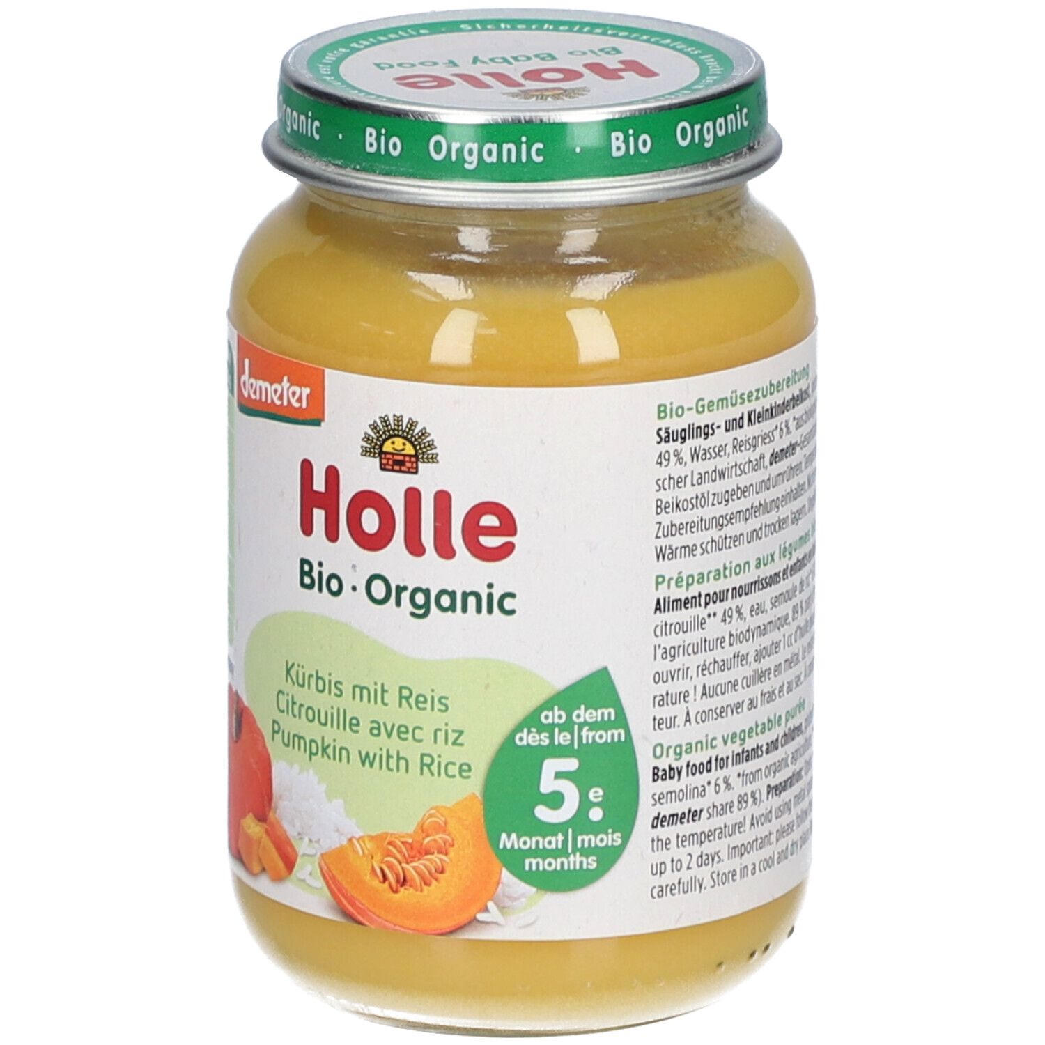 Органическое детское питание Holle Bio Kürbis mit Reis - овощное пюре с тыквой и рисом для детей от 4 месяцев. Без сахара, глютена, яиц, соли и молочного белка. Подходит для начала прикорма, имеет гипоаллергенные свойства и способствует нормализации стула.