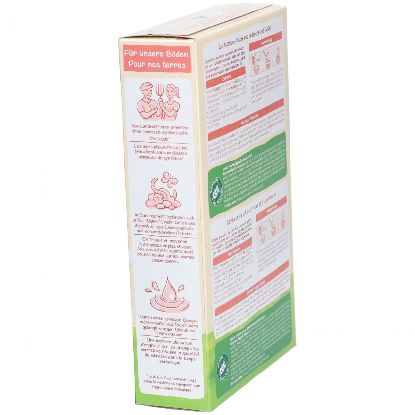 Состав: Цельнозерновая овсяная мука* 40%, цельное сухое молоко* (из частично обезжиренного молока) 40%, сушеные кусочки яблока* 7,5%, клубничный порошок* 1,8%, карбонат кальция, витамин B1 (тиамин). *из органического сельского хозяйства. Содержит молоко, глютен, сою и люпин. Может содержать следы горчицы.