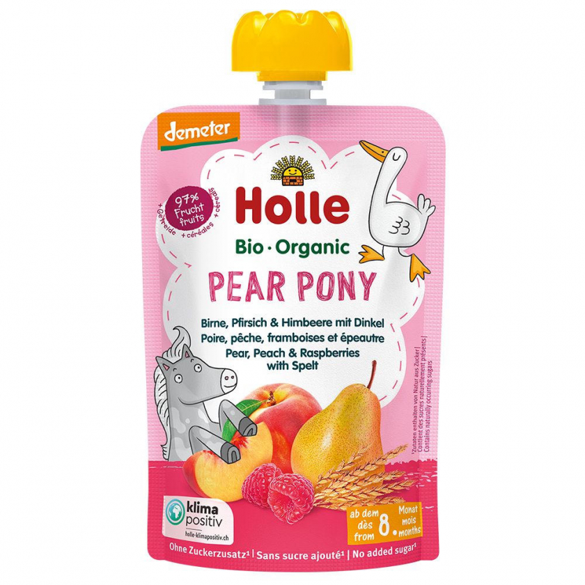 Органическое фруктово-овощное пюре Holle Bio Organic PEAR PONY для детей от 8 месяцев. Деметер-сертифицированный продукт без добавления сахара и соли, содержит грушу, персик, малину и полбу. Удобная упаковка для перекусов и прогулок.