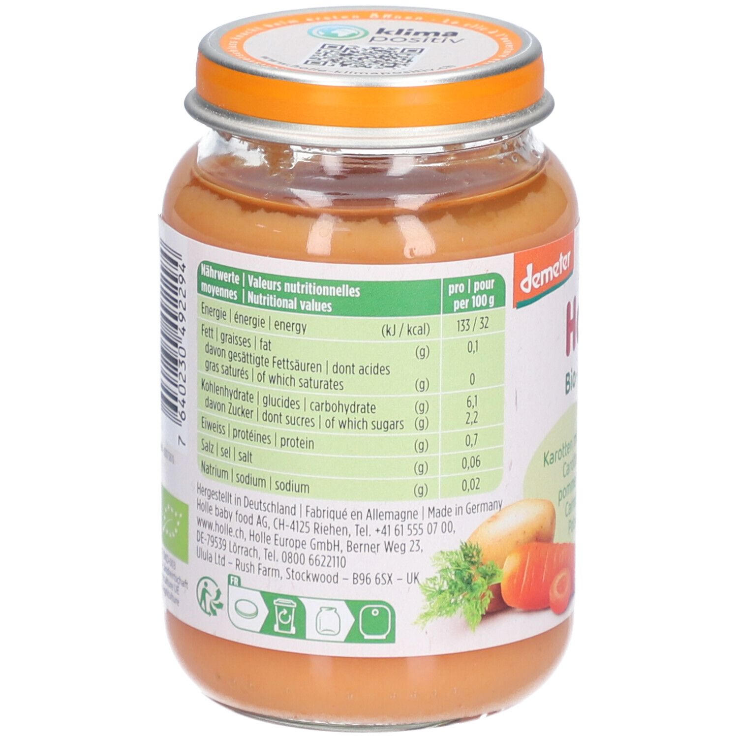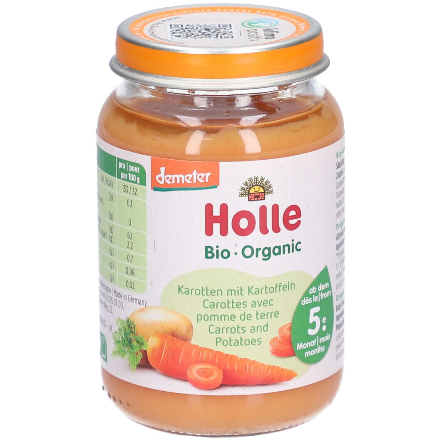 Органическое детское питание Holle с тыквой, кабачками и картофелем для детей от 6 месяцев. Без добавления сахара, соли, специй и ароматизаторов. Подходит для веганов, не содержит лактозу и глютен. Произведено в Швейцарии из биодинамических ингредиентов Demeter.
