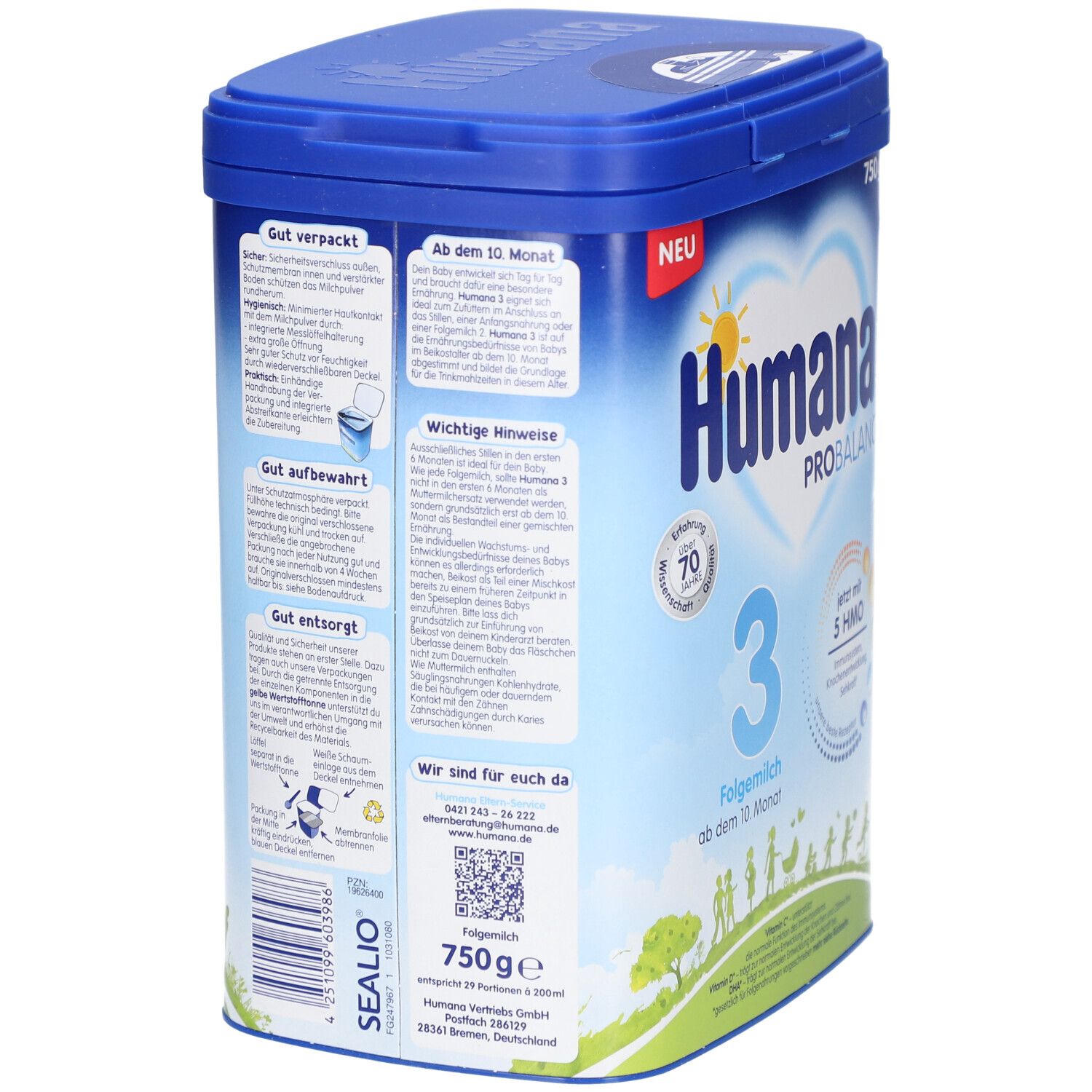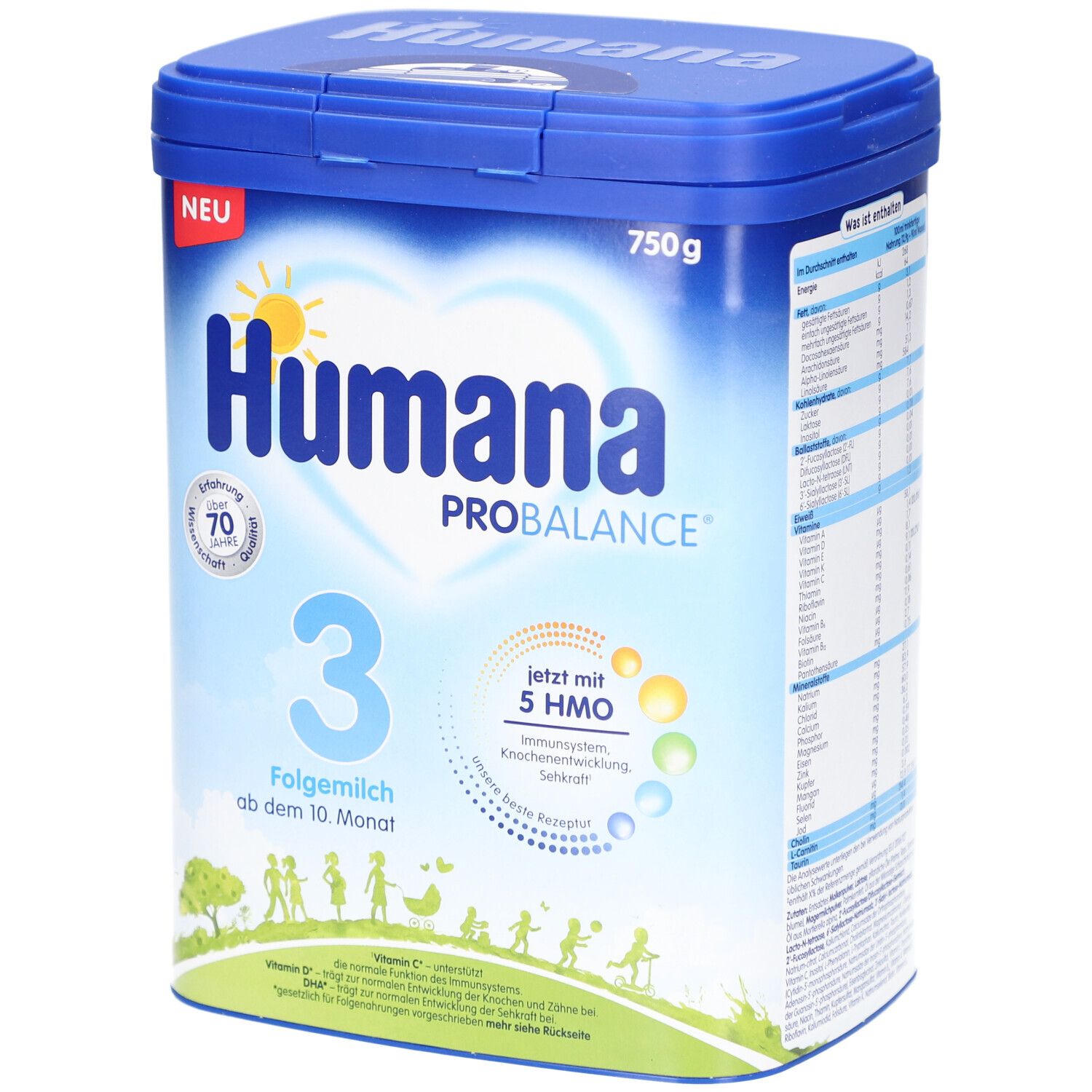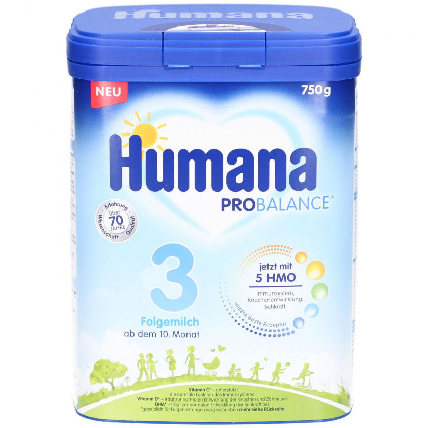 Humana PROBALANCE 3 - детская молочная смесь для детей от 10 месяцев с 5 HMO, DHA, GOS, ALA, витаминами и минералами для поддержки иммунитета, развития костей и зрения. Подходит для смешанного питания с прикормом. 750 г порошка.