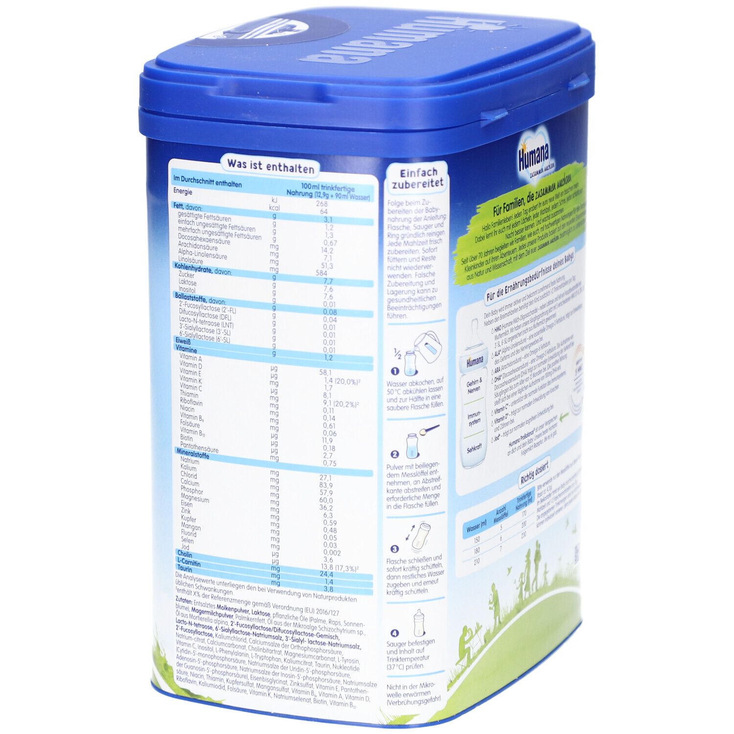 Состав: Магемильх, лактоза, растительные масла (пальмовое масло, рапсовое масло, подсолнечное масло), молочная сыворотка (частично деминерализованная), галактоолигосахариды (из молока), крахмал, олигосахариды (2'FL, LNnT, DFL, LNT, 3'SL), рыбий жир, карбонат кальция, хлорид калия, хлорид магния, L-фенилаланин, битартрат холина, витамин C, эмульгатор: соевый лецитин; L-триптофан, лактат железа, L-гистидин, инозитол, сульфат цинка, витамин E, ниацин, пантотеновая кислота, сульфат меди, витамин A, витамин B1, витамин B6, сульфат марганца, фолиевая кислота, йодид калия, селенат натрия, витамин K1, витамин D3, биотин, витамин B12