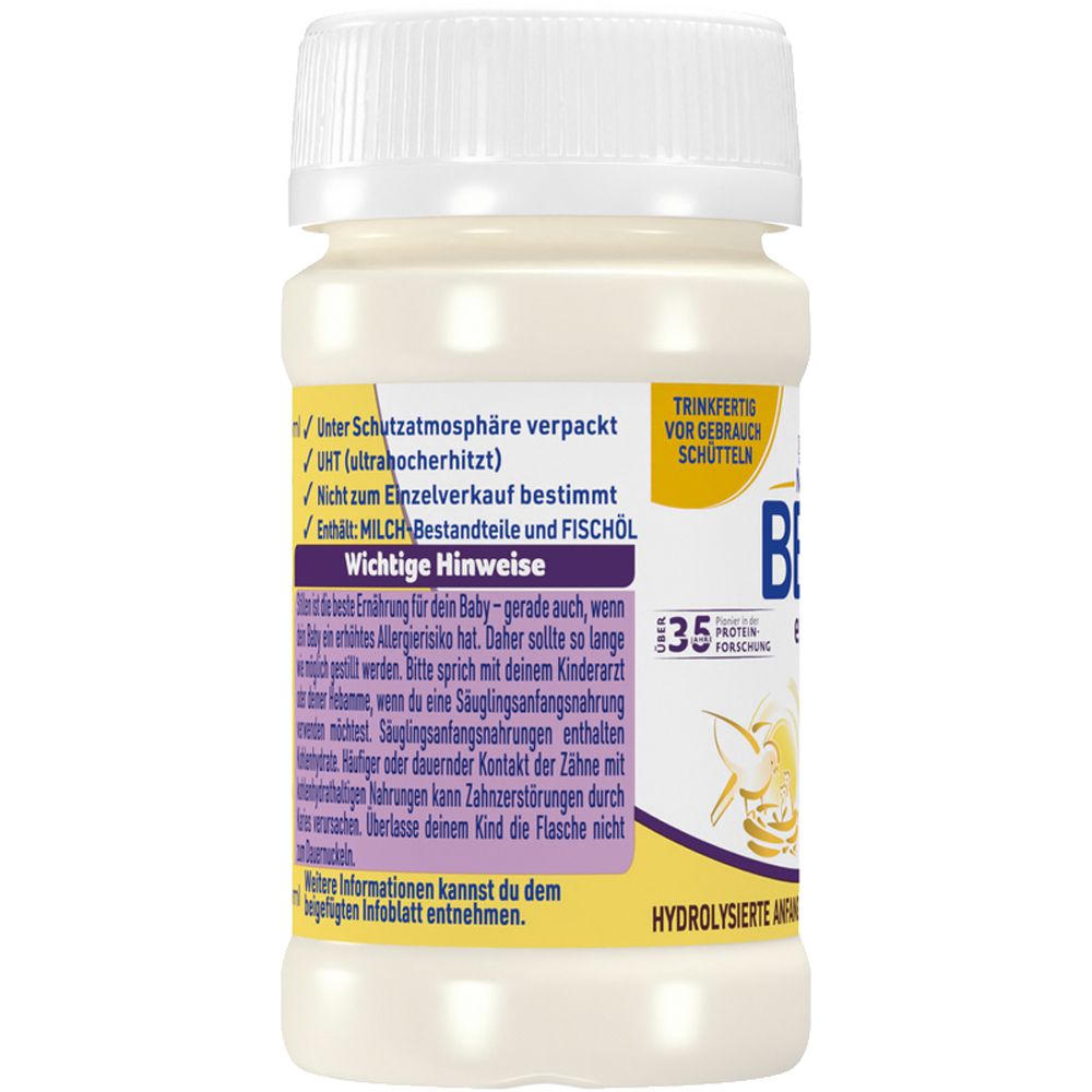 Готовая к употреблению гипоаллергенная начальная смесь для младенцев с рождения для снижения риска аллергии на коровье молоко. Содержит гидролизованный молочный белок, витамины и минералы для полноценного питания. Подходит для детей с риском аллергии, но не при уже существующей аллергии на коровье молоко.