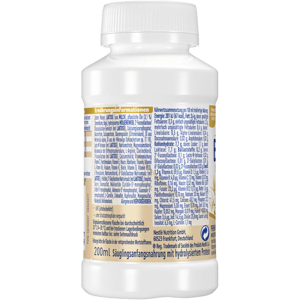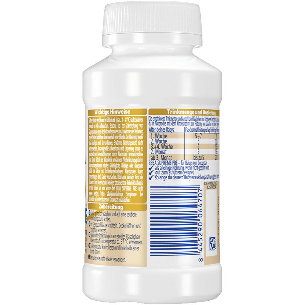 Nestlé BEBA SUPREME Pre - гипоаллергенная жидкая начальная молочная смесь для новорожденных с рождения. Содержит гидролизованный молочный белок для снижения риска аллергии, DHA (омега-3), пребиотики (2'-фукозиллактоза), без пальмового масла. Произведено в Германии по специальной технологии, подходит как единственное питание при отсутствии грудного вскармливания или для докорма.