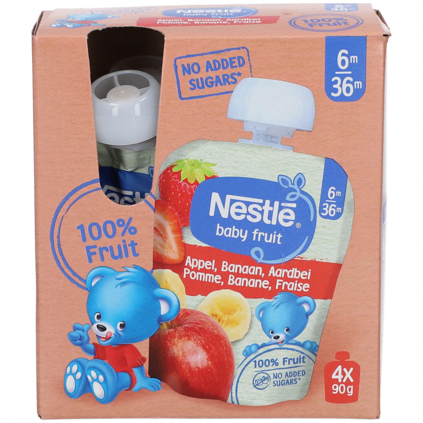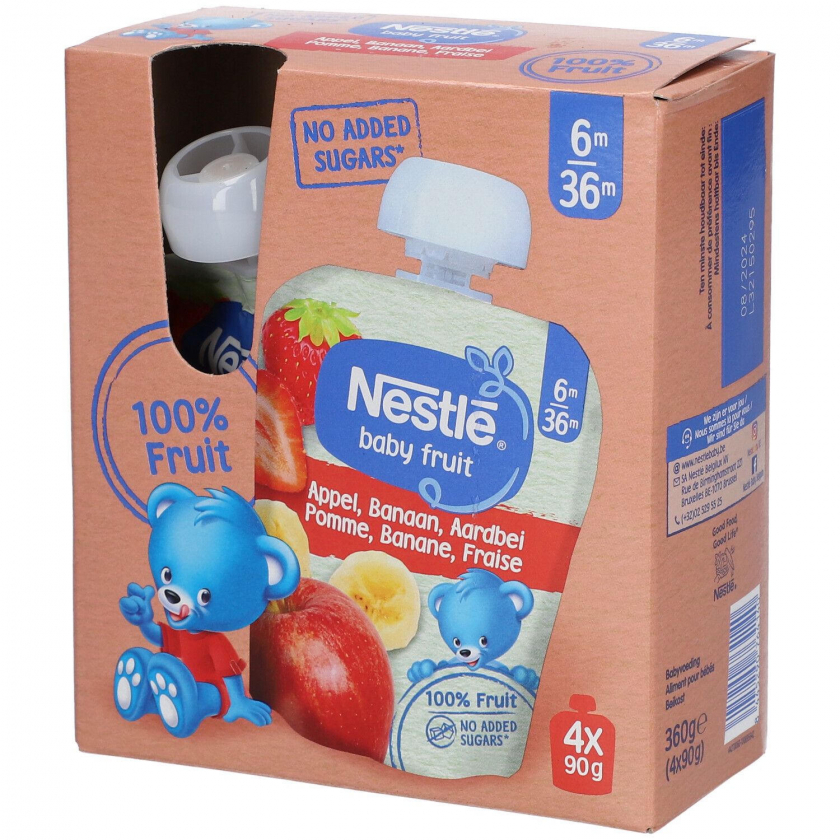 Детское фруктовое пюре NESTLE Baby Fruit с яблоком, бананом и клубникой для детей от 6 до 36 месяцев. Без добавления сахара, консервантов, красителей и искусственных ароматизаторов. Обогащено витамином C. Удобная упаковка 360 г для питания на ходу.
