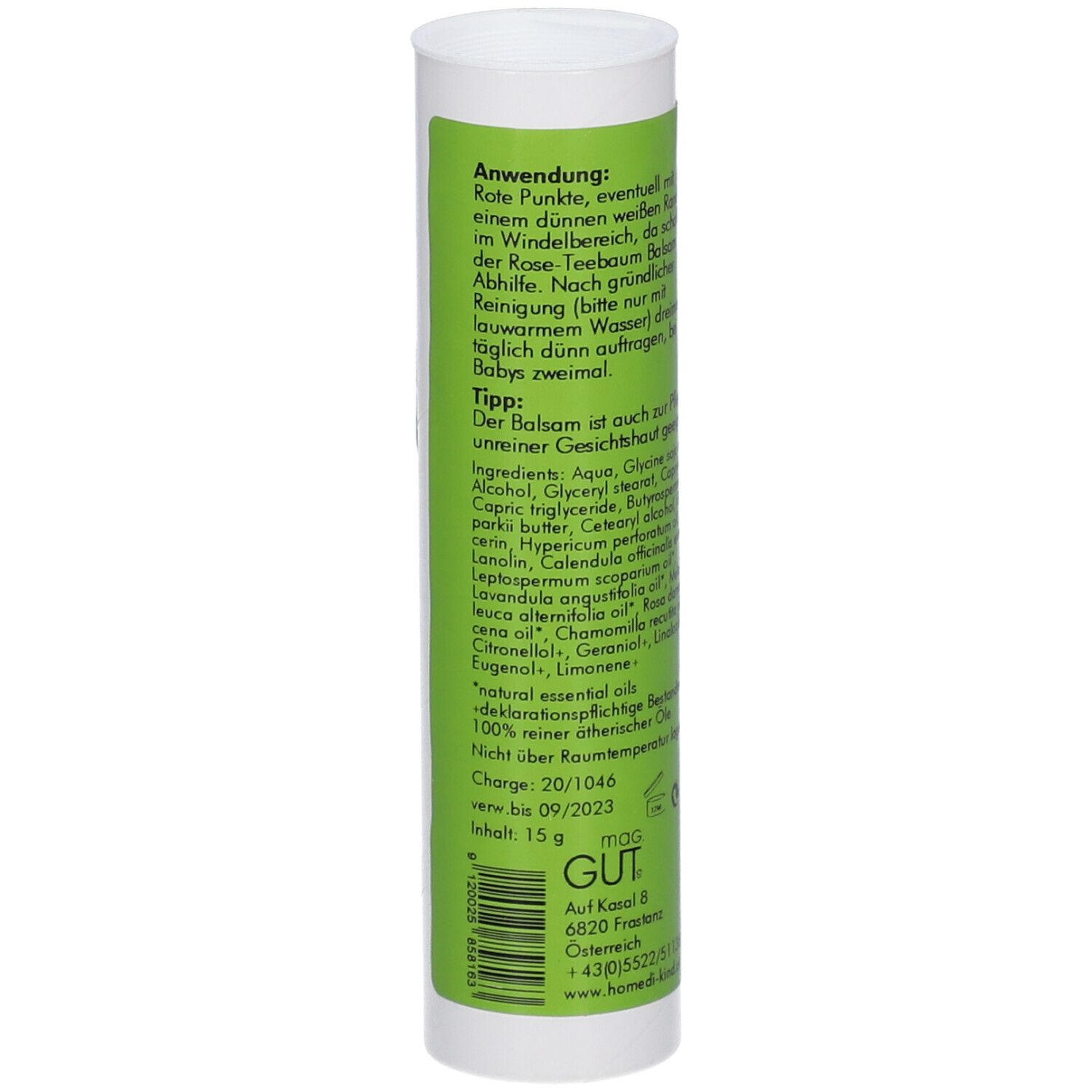 homedi-kind® Rose-Teebaum Balsam - универсальное средство для ухода за проблемной кожей, содержащее комбинацию гидролатов бессмертника, розы и чайного дерева с эфирными маслами лаванды, мануки, розы и чайного дерева. Подходит для ежедневного ухода за кожей взрослых и детей, включая младенцев.