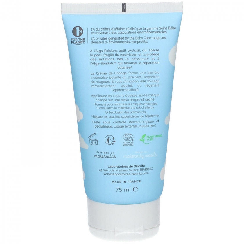 Гипоаллергенный крем от Laboratoires de Biarritz для ухода за кожей в области подгузника у детей. Создает защитный барьер, предотвращает покраснения, успокаивает и восстанавливает раздраженную кожу. Без отдушек, содержит эксклюзивные компоненты Alga-Paisium и Alga-Sendatu® для регенерации кожи.