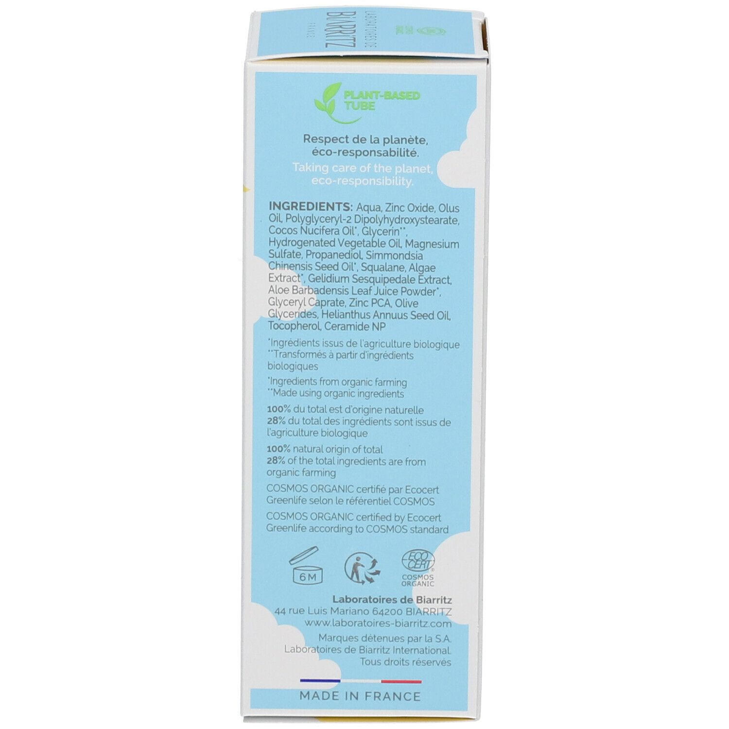 Вода, Оксид цинка, Масло олус, Полиглицерил-2 диполигидроксистеарат, Масло кокоса*, Глицерин**, Гидрогенизированное растительное масло, Сульфат магния, Пропандиол, Масло семян жожоба*, Сквалан, Экстракт водорослей*, Экстракт Gelidium Sesquipedale, Порошок сока листьев алоэ вера*, Каприлат глицерила, Цинк PCA, Глицериды оливы, Масло семян подсолнечника, Токоферол, Церамид NP (*ингредиенты из контролируемого органического земледелия)