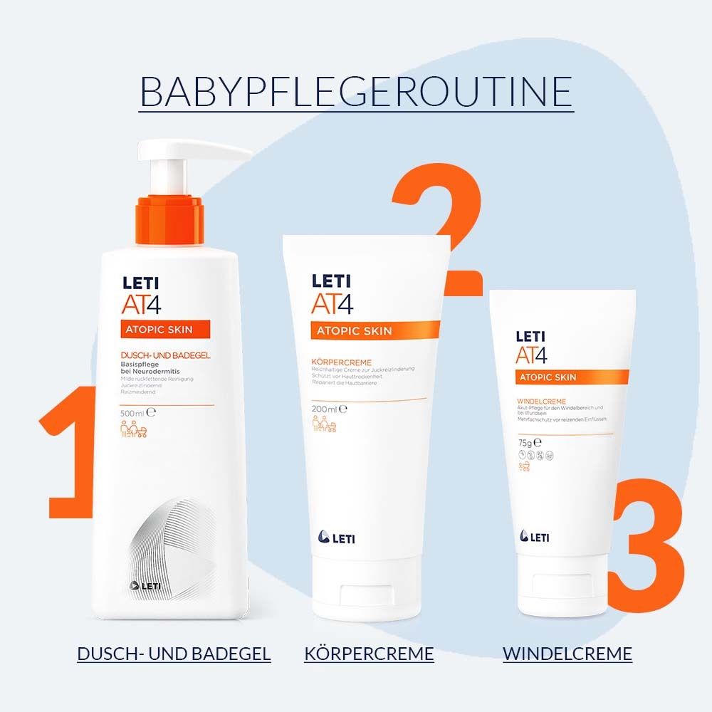LETI AT4 Windelcreme - специальная крем-паста для ухода за кожей в области подгузников у младенцев и детей. Образует защитный барьер, впитывает излишнюю влагу, снимает воспаление и восстанавливает кожный барьер. Подходит для детей с 3 месяцев, особенно при сухой коже и склонности к нейродермиту. Не содержит парабенов, протестирована дерматологически и педиатрически.