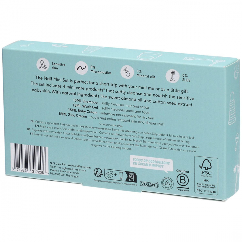 Набор NAÏF® Baby- und Kinder-Miniset включает 4 продукта для ухода за кожей и волосами новорожденных и детей в удобной дорожной упаковке: мягкий шампунь, очищающий гель, питательный крем и лосьон для тела. Все продукты гипоаллергенны, не содержат SLES, парабенов, минеральных масел и микропластика, имеют нейтральный pH и дерматологически протестированы.