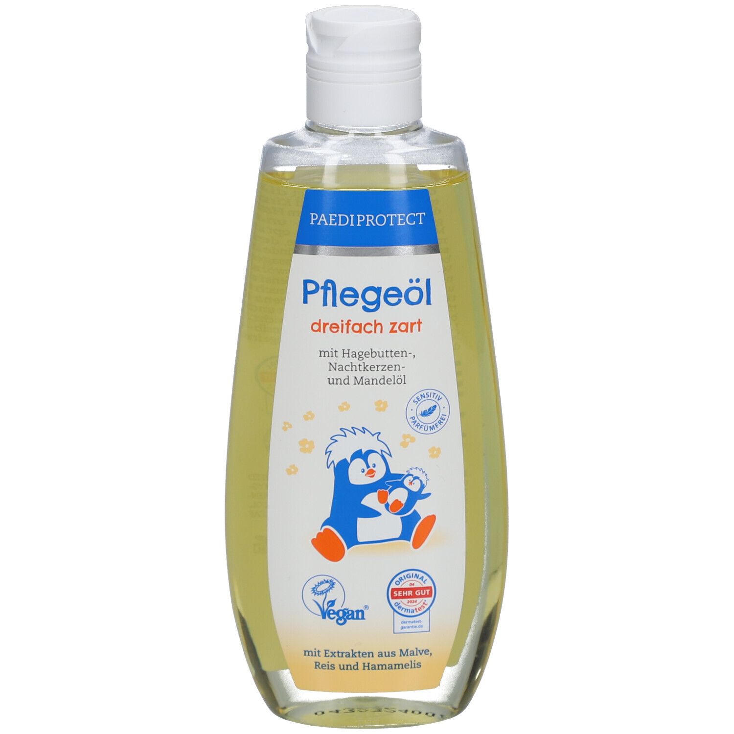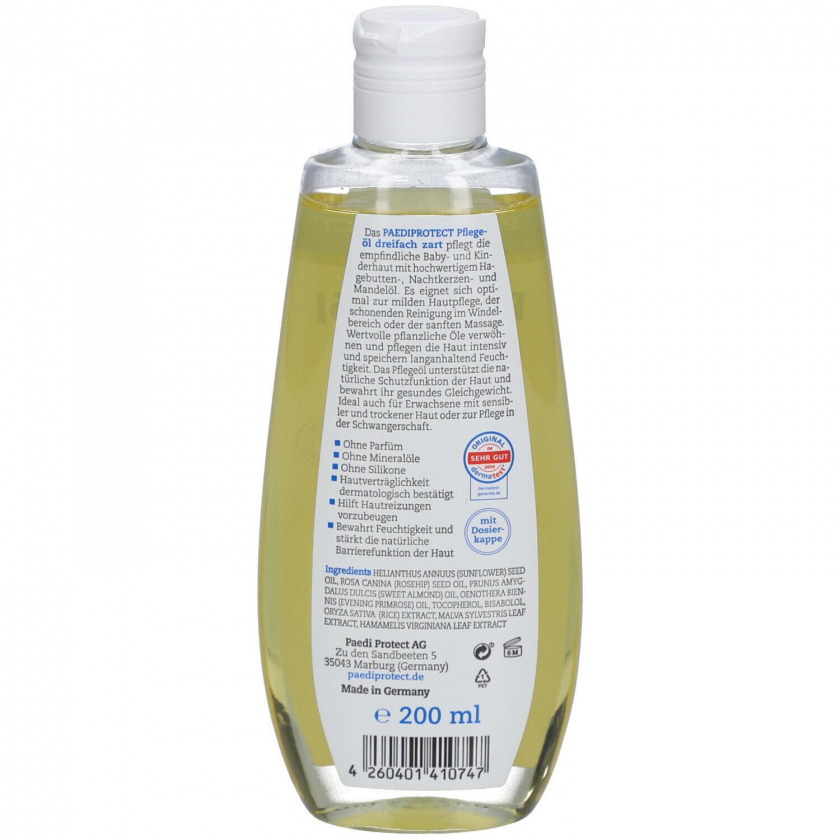 Нежное масло для ухода Paediprotect с тройным действием для чувствительной кожи младенцев и детей. Содержит масла шиповника, примулы вечерней и миндаля. Без парфюма, минеральных масел и силиконов. Подходит для нежного массажа, ухода за кожей и профилактики раздражений. Дерматологически протестировано. Также подходит для взрослых с чувствительной или сухой кожей и для ухода во время беременности.