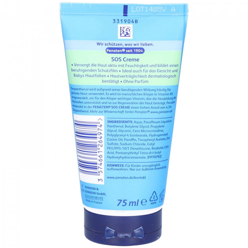 Крем Penaten SOS для детей с 4,3% декспантенолом активно увлажняет кожу, создает защитный барьер, успокаивает легкие раздражения и покраснения. Подходит для лица и кожных складок младенцев. Дерматологически протестирован, без отдушек.