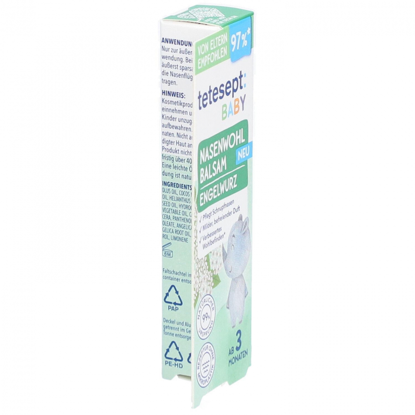 tetesept® Baby Nasenwohl Balsam - нежный арома-бальзам для ухода за носом младенцев от 3 месяцев. Создает мягкий освобождающий ароматический эффект, ухаживает за чувствительной кожей, защищает естественный кожный барьер. Особенно полезен в период простудных заболеваний.