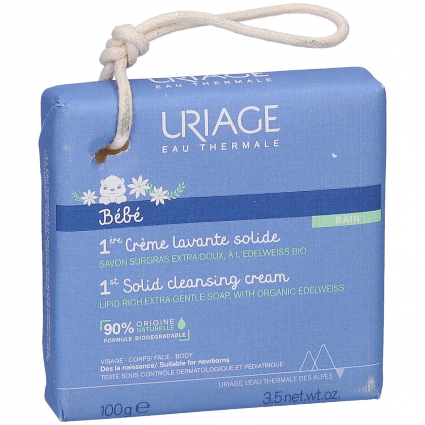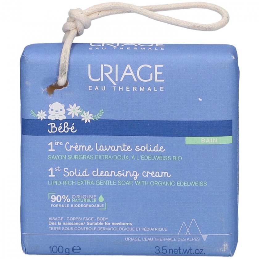 Твердая детская душ-крем для бережного очищения и защиты нежной кожи младенцев. Содержит комплекс термальной воды Uriage и органического эдельвейса для мгновенного комфорта. Подходит для ежедневного использования, обеспечивает мягкость и нежность кожи.