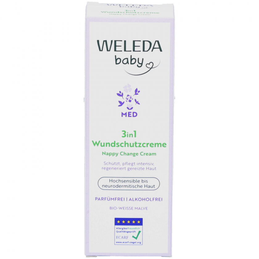 Weleda Baby Med 3in1 Wundschutzcreme - защитный крем от опрелостей для высокочувствительной и очень сухой кожи младенцев. Содержит экстракт белой мальвы, масло вечерней примулы и натуральные компоненты. Надежно защищает от опрелостей, успокаивает раздраженную кожу, уменьшает покраснения и раздражения, поддерживает естественные функции кожи. Без отдушек и алкоголя, гипоаллергенный, сертифицирован ECARF.