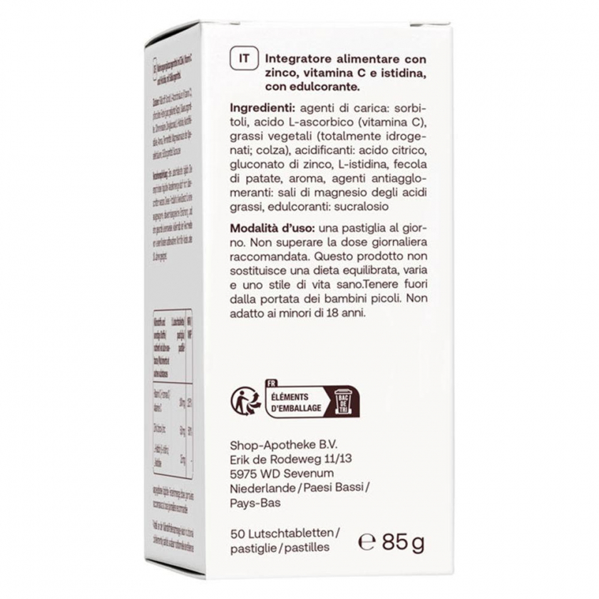 Состав: Наполнитель: сорбит, L-аскорбиновая кислота (витамин C), растительные жиры (полностью гидрогенизированные; рапс), подкислитель: лимонная кислота, глюконат цинка, L-гистидин, картофельный крахмал, ароматизатор, разделитель: соли магния жирных кислот, подсластитель: сукралоза