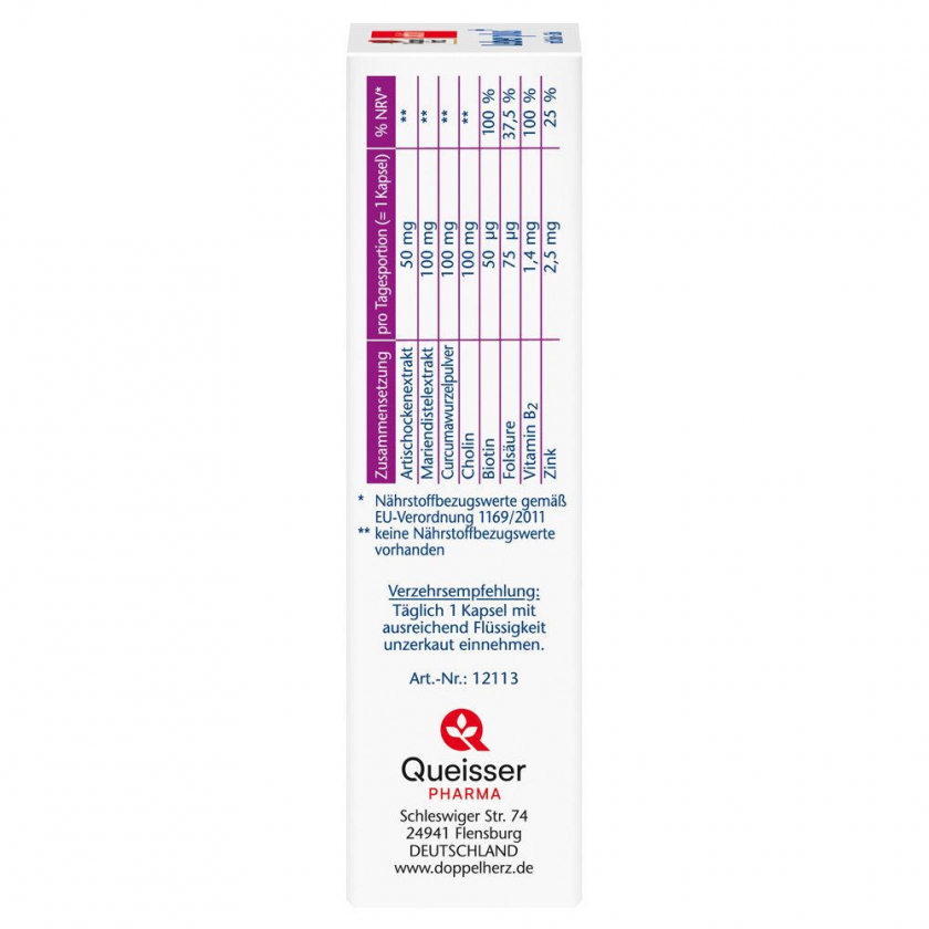 Биологически активная добавка Doppelherz® aktiv Leber plus с холином, цинком и тройной комбинацией растительных экстрактов (расторопша, артишок, куркума) для поддержания нормальной функции печени и пищеварения. Содержит витамины группы B и минералы.